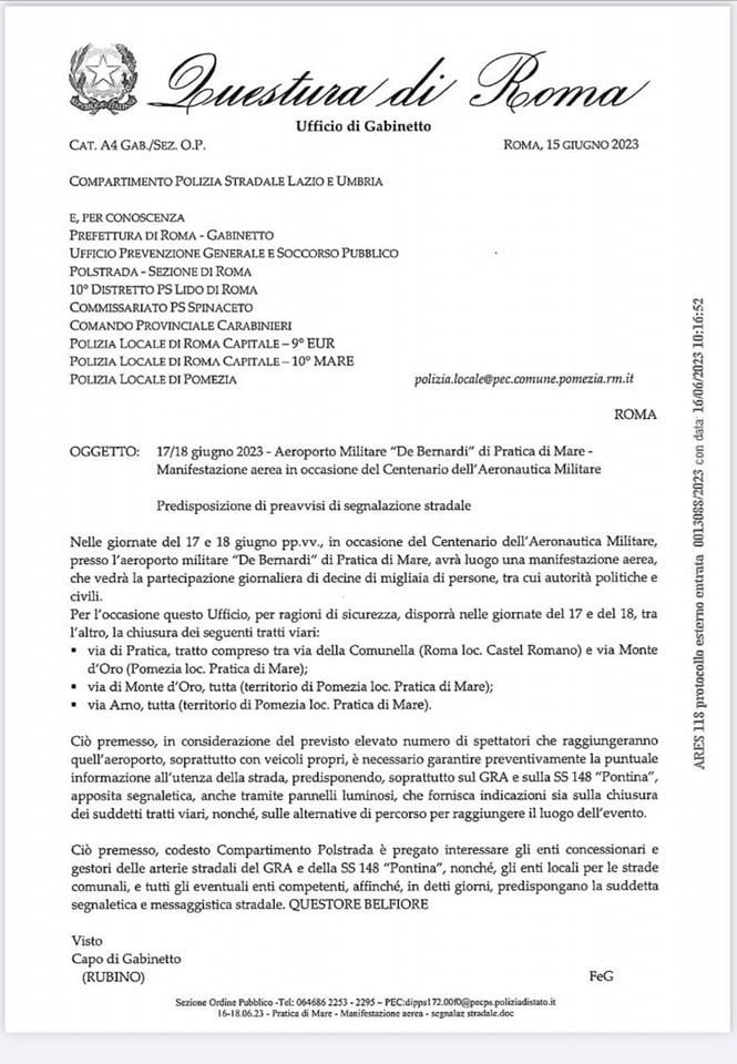 Centenario dell’Aeronautica Militare, in vista del fine settimana di eventi organizzato a Pratica di Mare, la Questura di Roma per motivi di sicurezza ha disposto la chiusura dei tratti viari di via d...