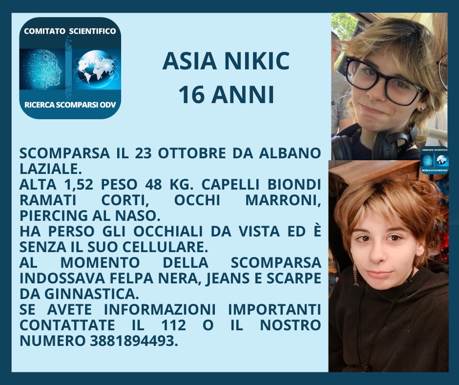 Scomparsa da Pavona, ad Albano, una giovane di 16 anni Asia/Andrea Nikic. Non si hanno notizie dal 23 ottobre scorso, i familiari stanno facendo di tutto per ritrovarla. Al momento della scomparsa ind...