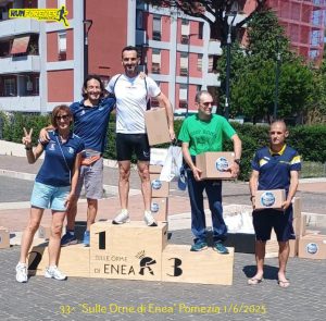 La più veloce donna a tagliare il traguardo è stata la nostra Pamela Gabrielli con un fantastico tempo di 42’05” che ha meritato il gradino più in alto del podio. Emanuele Battaglia è giunto 6° assoluto con 36’30” aggiudicandosi il 1° premio di categoria SM35, Christian Margiotta con 37’44” ha tagliato il traguardo in 8^ posizione ed anche lui a premio 2° tra glia atleti SM45, Gianluigi Bianchini è giunto 16°, 40’07”” il suo tempo e si è aggiudicato il 4° premio nella categoria SM45, Rocco Di Fede con 51’49” ha tagliato il traguardo al 124° posto.
