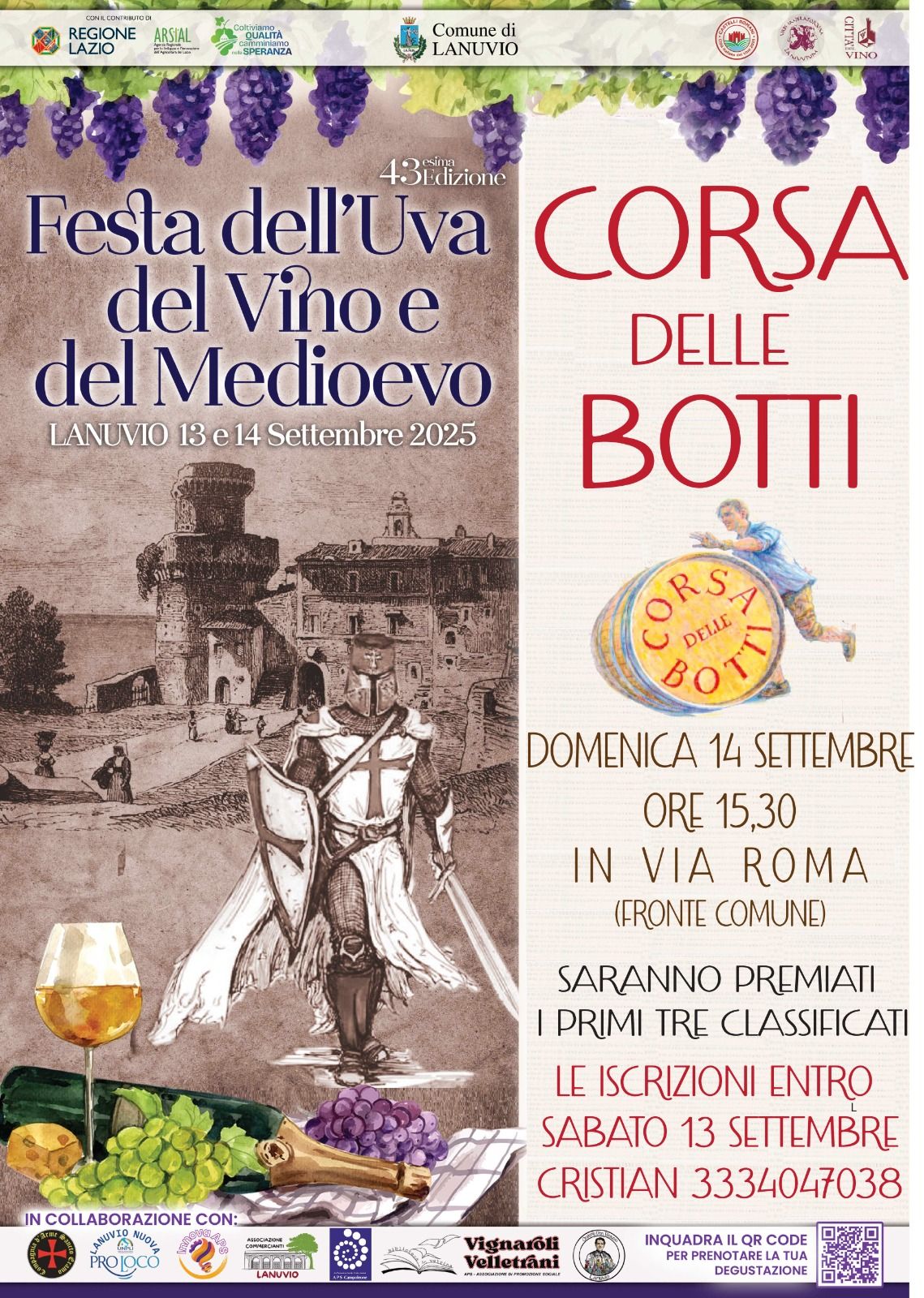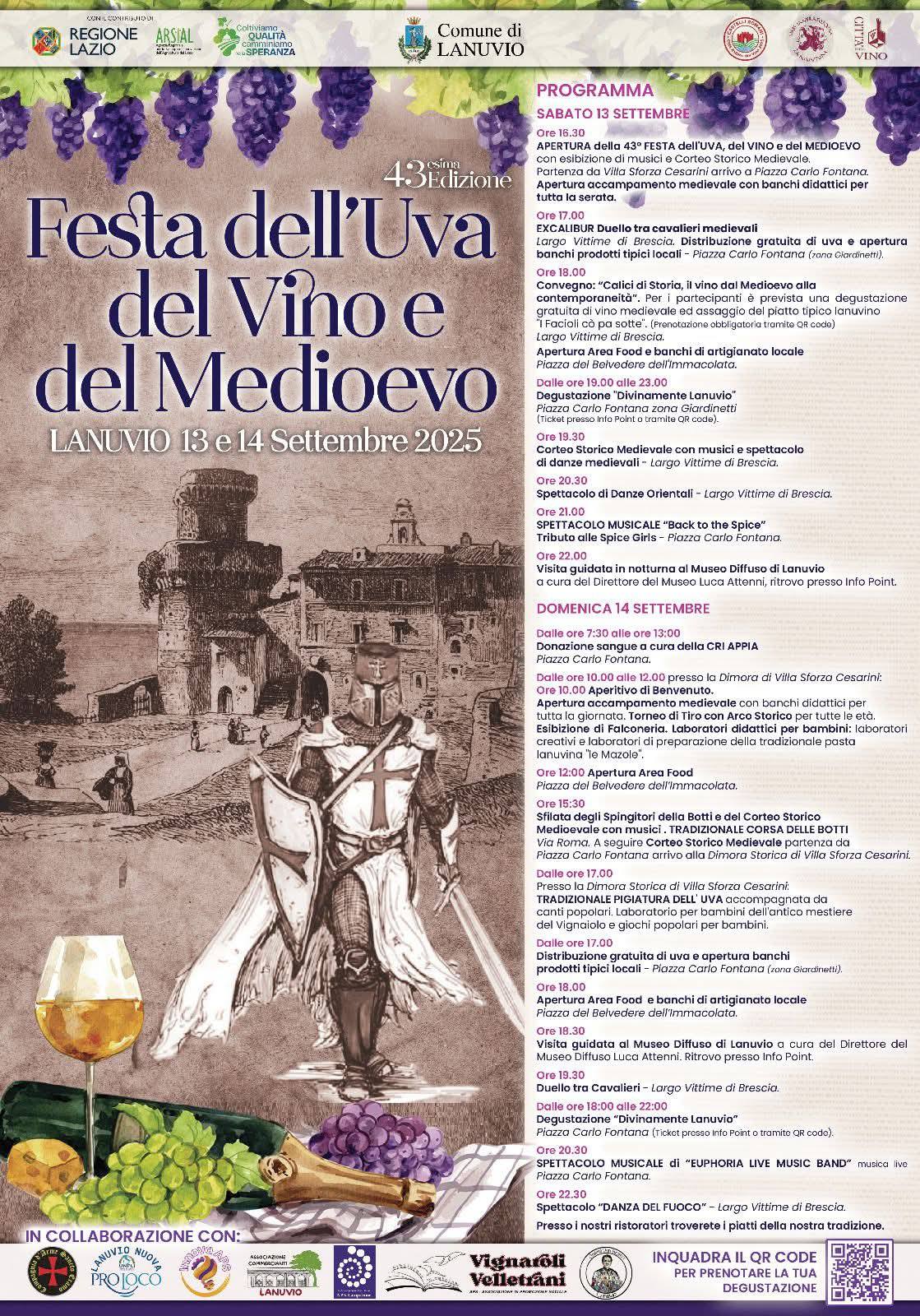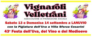 L’Associazione Vignaroli Velletrani APS prende parte alla 43esima Festa dell’Uva e del Vino che si svolge questo fine settimana, sabato 13 e domenica 14 Settembre a Lanuvio in chiave medievale.