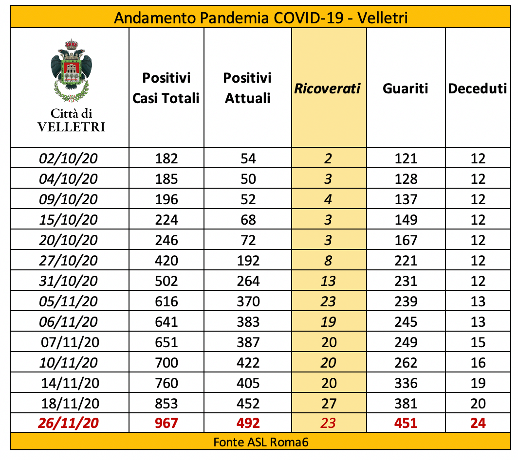 492 gli attuali positivi al Covid a Velletri. 40 nuovi casi nell’ultima settimana e 4 decessi. “L’ultimo resoconto della Asl Roma6 – ha spiegato il Sindaco, Orlando Pocci - ha confermato un leggero rallentamento dell'epidemia che, tuttavia resta ancora con numeri molto elevati. Purtroppo – conferma - si registrano anche 4 decessi in più rispetto all’ultima rilevazione ed il numero totale delle vittime sale a 24”. Dei 492 positivi totali, 23 sono ricoverati in ospedale.