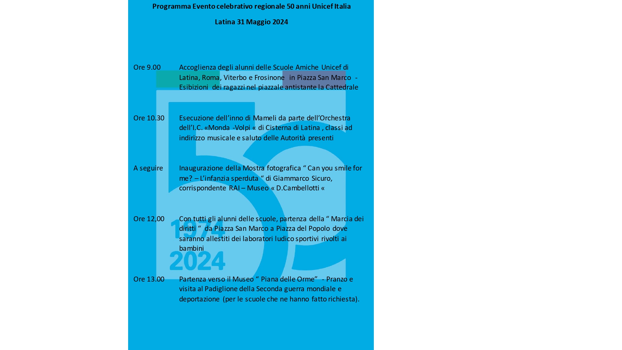 In occasione del 50esimo anniversario della fondazione di Unicef Italia, il Fondo delle Nazioni Unite per l'Infanzia ha deciso di tenere a Latina le celebrazioni di questa importante ricorrenza, per quanto riguarda i comitati provinciali del Lazio. L’appuntamento è per venerdì 31 maggio, a partire dalle 9.00, in Piazza San Marco. Oltre a quelli del capoluogo pontino, arriveranno anche gli alunni delle scuole Roma, Viterbo e Frosinone. Alle 12.00 partiranno in corteo per la “Marcia dei diritti” verso piazza del Popolo. Alle 13.00 ci sarà una visita al Museo storico del giocattolo, a Piana delle Orme.