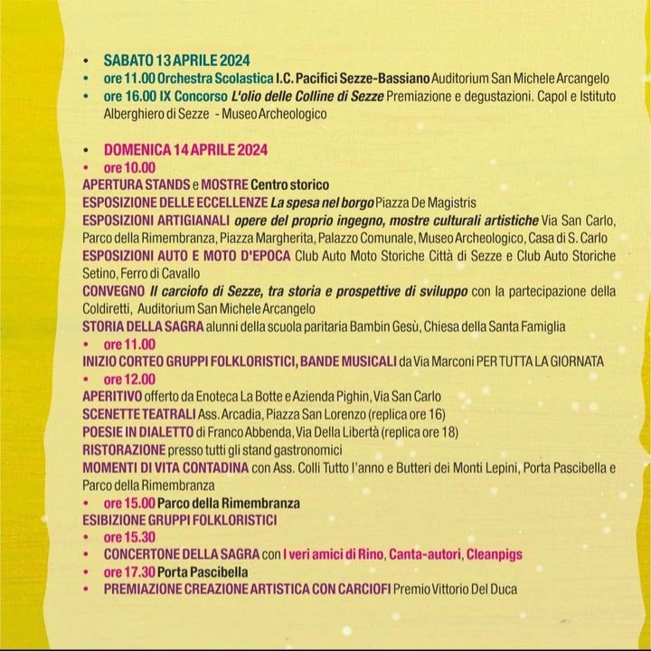 Questo fine settimana a Sezze va in scena la 53esima edizione della "Sagra del Carciofo". Domani e domenica 14 aprile, per le vie del centro storico, stand, mostre ed esposizioni artigianali. Ci saranno convegni, musica dal vivo, esibizioni di gruppi folkloristici e si potranno vivere momenti di vita contadina. La Pro Loco ha, inoltre, organizzato delle passeggiate turistiche.