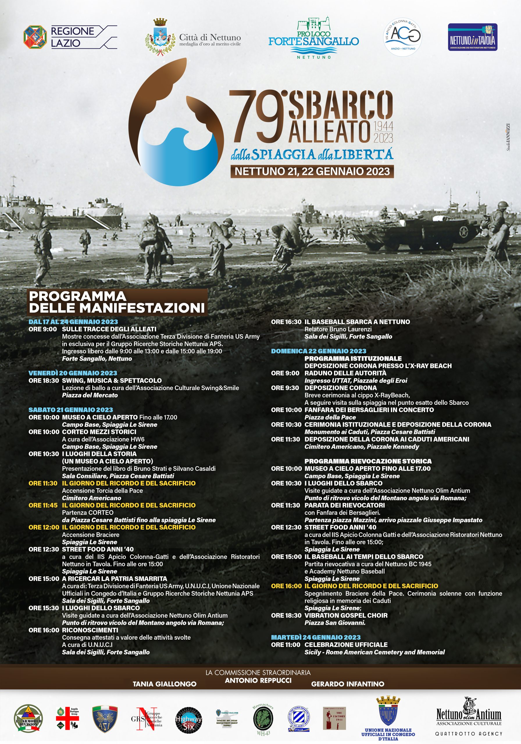Le celebrazioni si sono aperte ieri con una mostra al Forte Sangallo denominata “Sulle tracce degli alleati” che durerà fino a martedì 24 gennaio, le mostre sono concesse dall’associazione Terza Divisione di Fanteria US Army in esclusiva per il Gruppo Ricerche Storiche Nettunia APS.