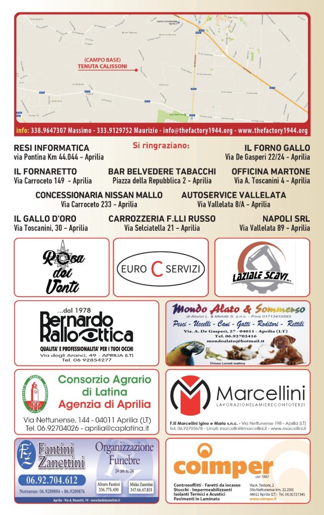 L’iniziativa è dell’associazione The Factory 1944 che accompagnerà i presenti nel campo base e in un percorso creato appositamente all’interno della tenuta. Non mancheranno lezioni gratuite di fumetto in collaborazione con la “School Comix di Aprilia”, la musica con le “Swingeresse” ed un concorso fotografico.