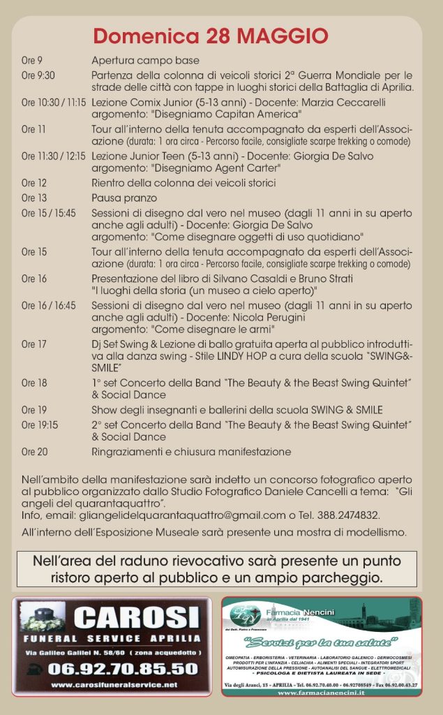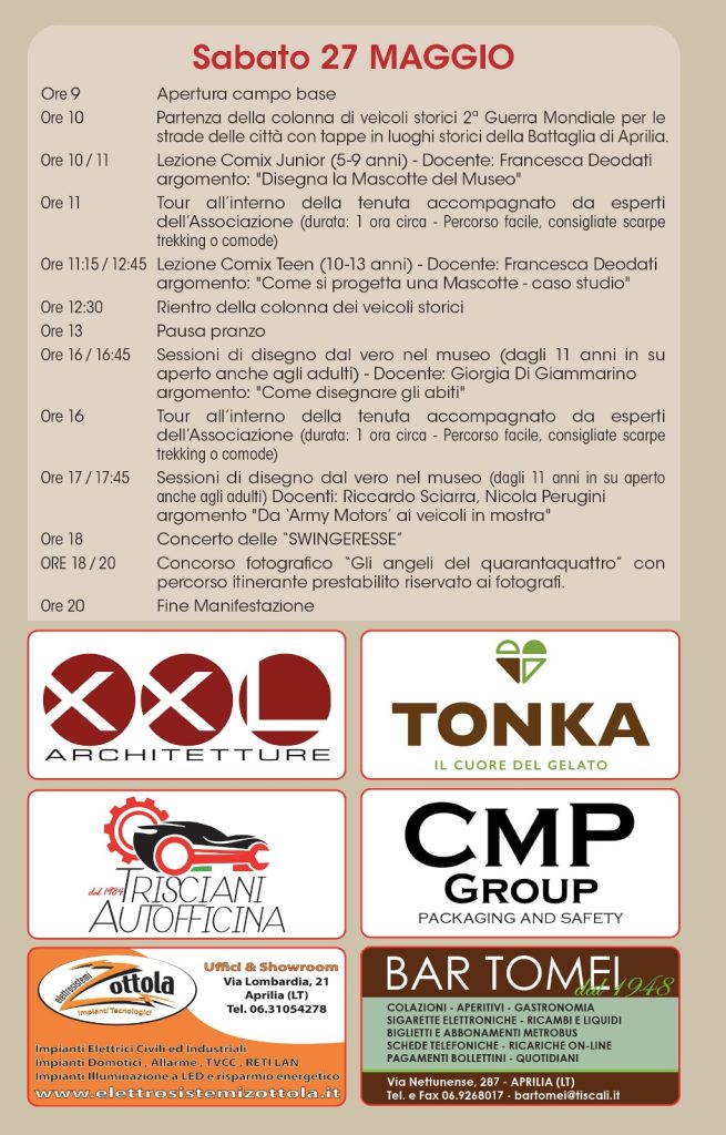 79esimo anniversario della Battaglia di Aprilia: un fine settimana dedicato alla storia. Appuntamento per questo sabato 27 maggio e per domani, e domenica 28 maggio, presso la tenuta “Calissoni-Bulgari” di Aprilia, in via Riserva Nuova 56. In programma il “10° raduno di veicoli storici della seconda guerra mondiale”.