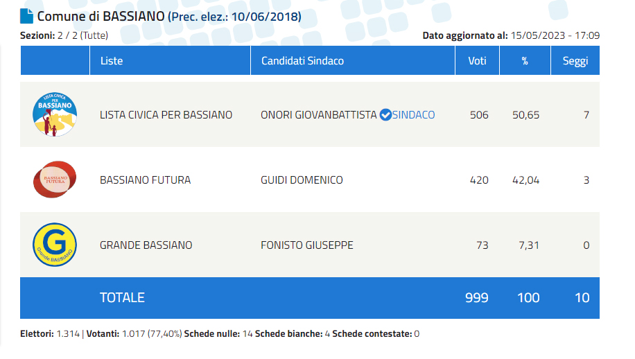La città di Bassiano ha eletto il suo sindaco: Giovanbattista Onori ha vinto, battendo l’ex primo cittadino Domenico Guidi. Resta indietro il terzo candidato Giuseppe Fonisto. Onori ha ottenuto il 50.65% dei voti. Guidi si è fermato al 42%.