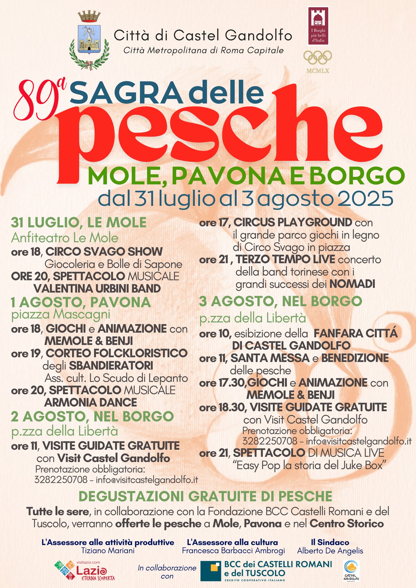 Quest’anno Castel Gandolfo si appresta a vivere la sua ottantanovesima edizione della Sagra delle Pesche, una tradizione lunga quasi un secolo e che dal 31 luglio al 3 agosto verrà celebrata con 4 giorni di eventi diffusi sul territorio.