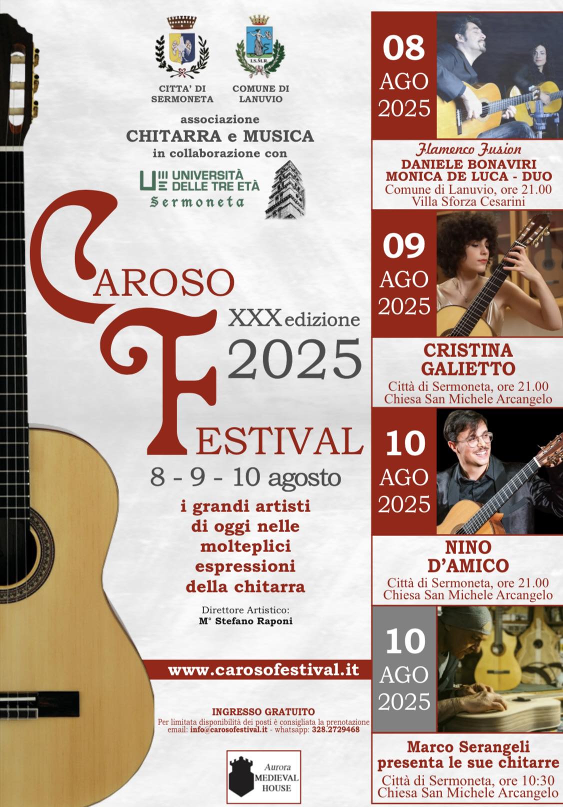 Prosegue con la musica la rassegna “Tra mito e realtà” organizzata per tutta l’estate dal Comune di Lanuvio presso Villa Sforza Cesarini: questo venerdì 8 agosto si terrà una tappa della 30esima edizione del Caroso Festival, prestigiosa kermesse dedicato alla chitarra classica. Per l’occasione si esibirà il duo formato da Daniele Bonaviri e Monica De Luca per una serata Flamenco Fusion. L’ingresso è gratuito.