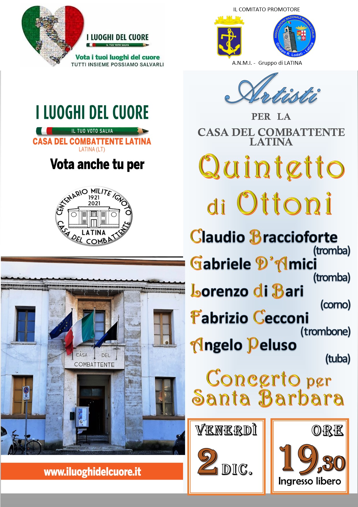 A Latina questa sera “Concerto per Santa Barbara” con il Quintetto di Ottoni “Latina Brass Quintet”. L’evento, che si terrà alle 19.30 presso la Casa del Combattente, in Piazza San Marco, rientra nella rassegna “Artisti per la Casa del Combattente”. L’ ingresso è gratuito.