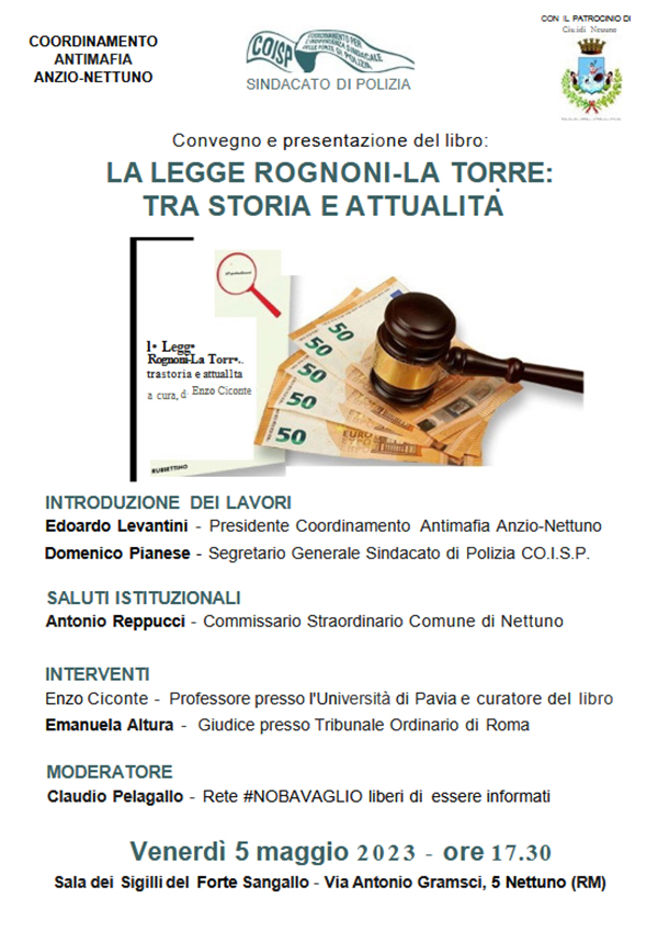 L’associazione “Coordinamento Antimafia Anzio-Nettuno” in collaborazione con il Sindacato di Polizia CO.I.S.P., ha organizzato per venerdì 5 maggio 2023, alle ore 17,30, presso la sala sigilli del Forte Sangallo in Nettuno, la presentazione del saggio “La legge Rognoni-La Torre tra storia e attualità” di Enzo Ciconte, professore di storia della criminalità organizzata. La legge Rognoni –La Torre ha istituito nel nostro Codice penale il reato di associazione di tipo mafioso ed ha previsto il sequestro e la confisca dei beni ai mafiosi. Rappresenta un pilastro della legislazione antimafia.