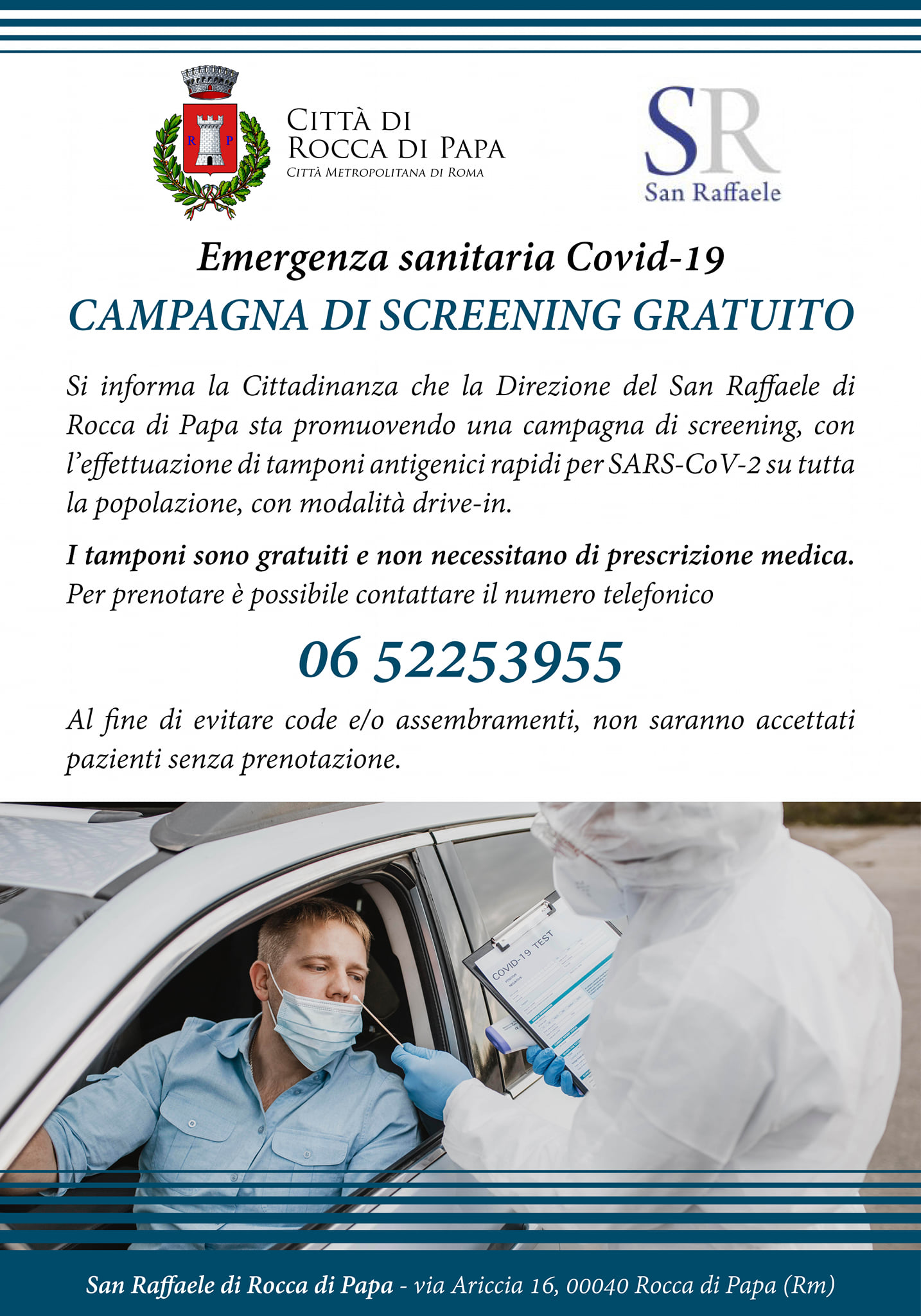 Emergenza sanitaria Covid-19. Si informa la Cittadinanza che la Direzione del San Raffaele di Rocca di Papa sta promuovendo una campagna di screening, con l’effettuazione di tamponi antigenici rapidi per SARS-CoV-2 su tutta la popolazione, con modalità drive-in.