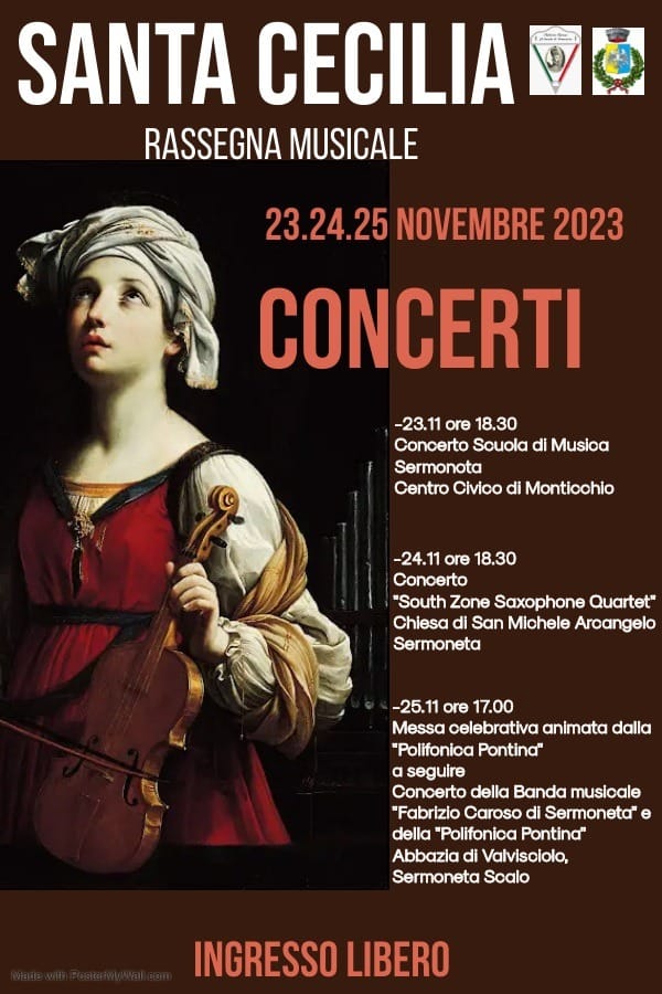 Sabato 25, alle ore 17, presso l'Abbazia di Valvisciolo si celebrerà la Messa in onore di Santa Cecilia animata dalla Polifonica Pontina. A seguire il Concerto della Banda musicale Fabrizio Caroso di Sermoneta diretta dal M° Michele Secci che unitamente alla Polifonica Pontina proporrà brani dal repertorio Sacro, Operistico, della Musica per Film e Sinfonico.