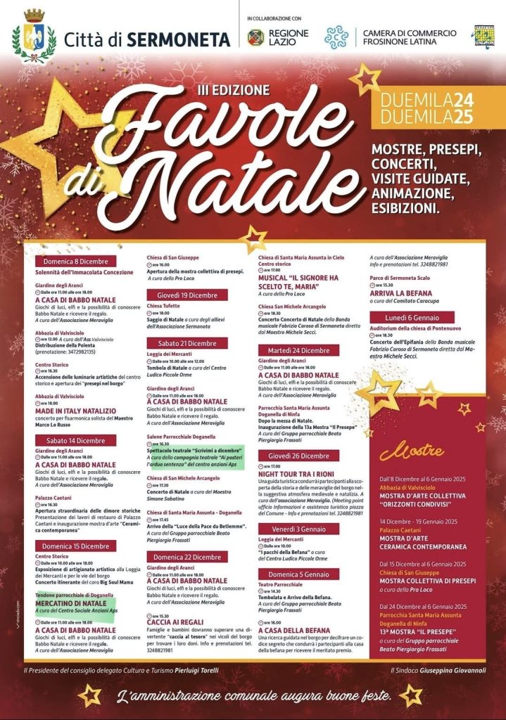 Le luminarie artistiche ed i presepi realizzati da artigiani e associazioni locali nel borgo di Sermoneta faranno da cornice suggestiva al programma “Favole di Natale”, il cartellone di eventi predisposto dall'amministrazione comunale di Sermoneta con la collaborazione di Pro Loco, associazione Meraviglia, comitati parrocchiali e di borgata e associazioni, con il contributo della Regione Lazio, che prenderà il via l'8 dicembre con una serie di appuntamenti tra concerti, visite guidate animate, mostre ed eventi.
