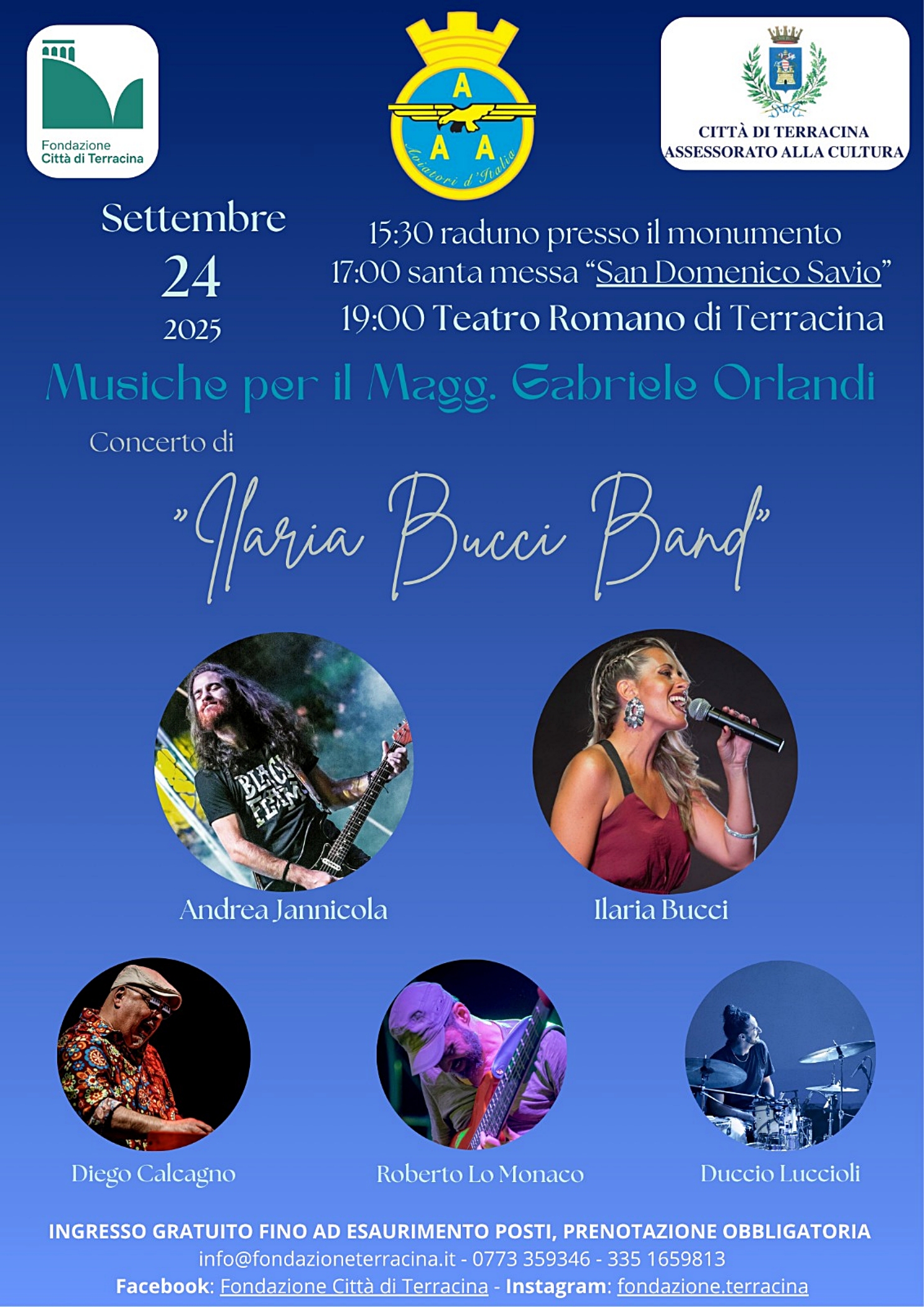 Protagonista del concerto al Teatro Romano sarà la “Ilaria Bucci Band”, formazione di altissimo livello composta da Ilaria Bucci (voce), Andrea Jannicola (chitarra), Roberto Lo Monaco (basso), Diego Calcagno (tastiere), Duccio Luccioli (batteria): un ensemble affiatato, accomunato dalla passione per la Black Music e capace di dare vita a un live show energico, raffinato e coinvolgente. Il repertorio della serata sarà un viaggio nella grande musica soul, dai “classici” di Etta James e Marvin Gaye fino alle sonorità contemporanee di Joss Stone, John Mayer e Alicia Keys, e comprenderà l’esecuzione di alcuni brani amati dal Maggiore Orlandi.