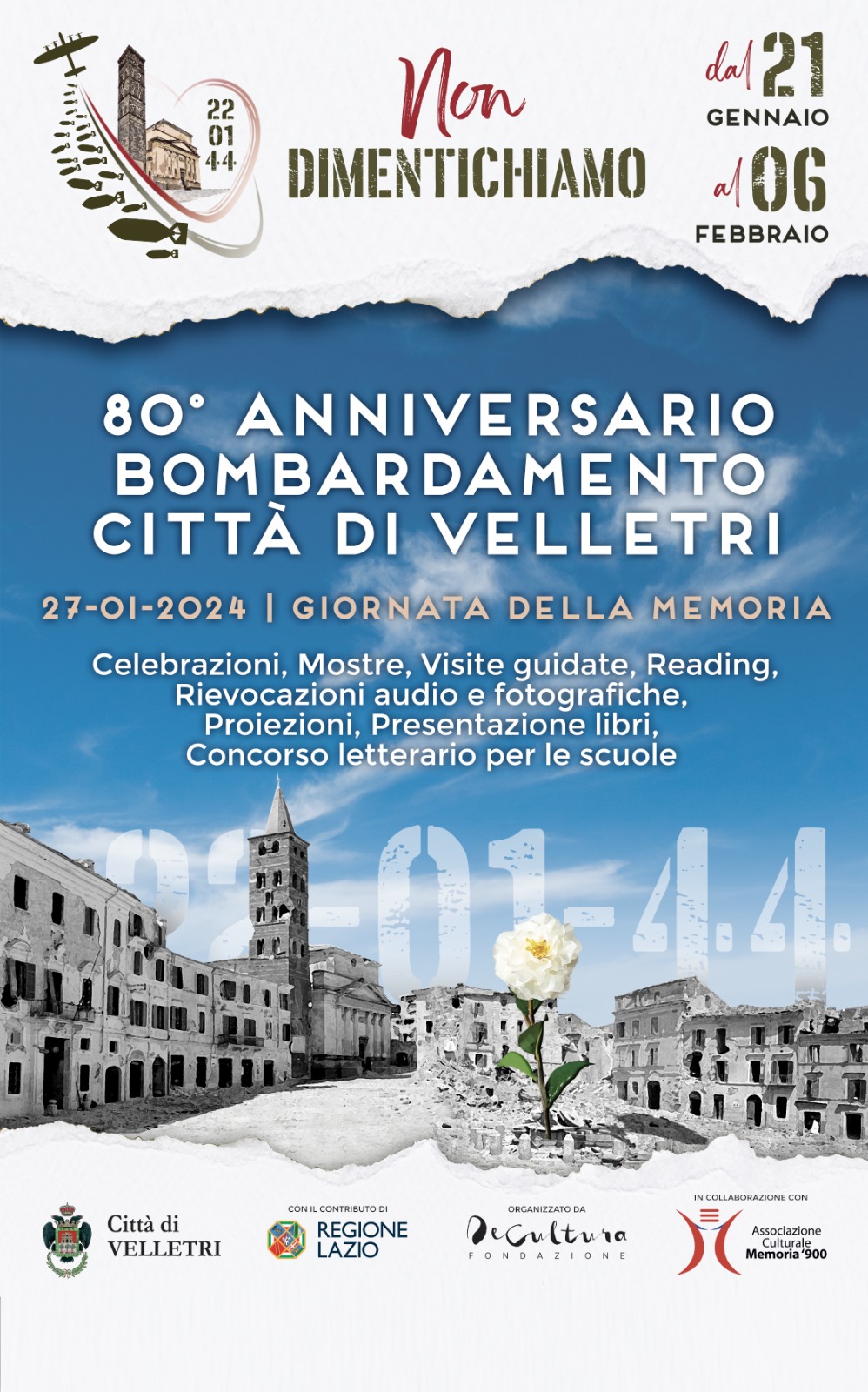 Il 22 gennaio 2024 ricorre l’ottantesimo anniversario del bombardamento che distrusse la città di Velletri. Era il lontano 1944 ma il fragore delle bombe ancora oggi risuona nelle ferite aperte che la comunità ricorda con grande partecipazione e commozione. Proprio per non dimenticare l’importante ricorrenza, il Comune di Velletri ha messo in campo una serie di iniziative culturali e celebrative, organizzate dalla Fondazione De Cultura in collaborazione con l’Associazione Memoria ‘900 e con il contributo della Regione Lazio.