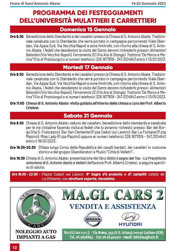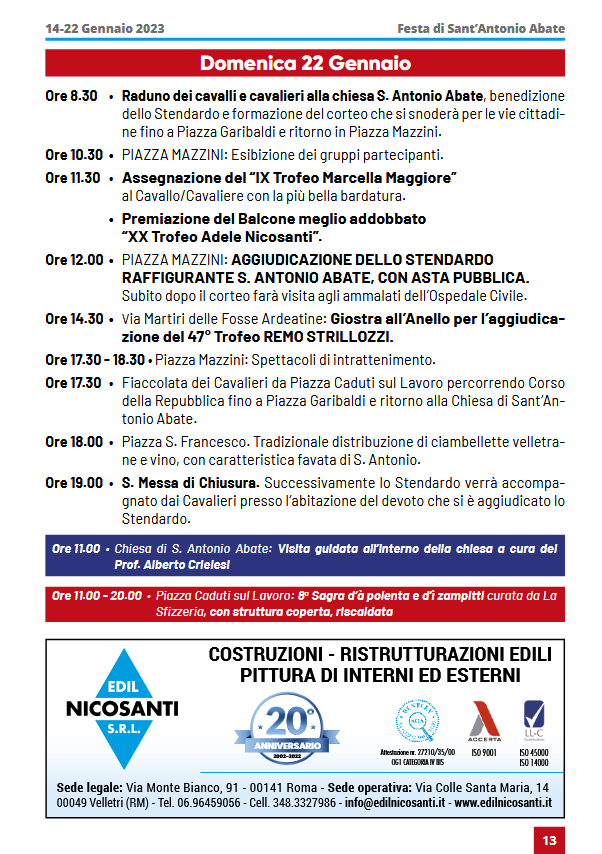 Dopo la messa, alle ore 18.30 presso i locali della Chiesa il Prof. Alberto Crielesi presenterà il suo libro Sotto il segno del Tau – La Precettoria antoniana di Sant’Antonio Abate a Velletri, a cui seguirà un aperitivo di saluto. Dalle ore 18 alle ore 22 a Piazza Caduti sul Lavoro si svolgerà l’Ottava edizione della Sagra D’a Polenta e D’i zampitti, a cura de La Sfizzeria.