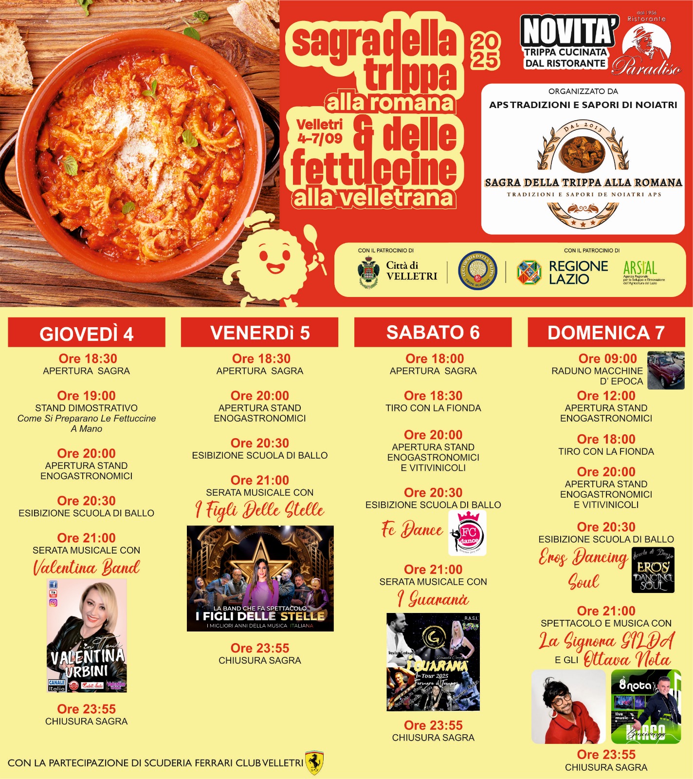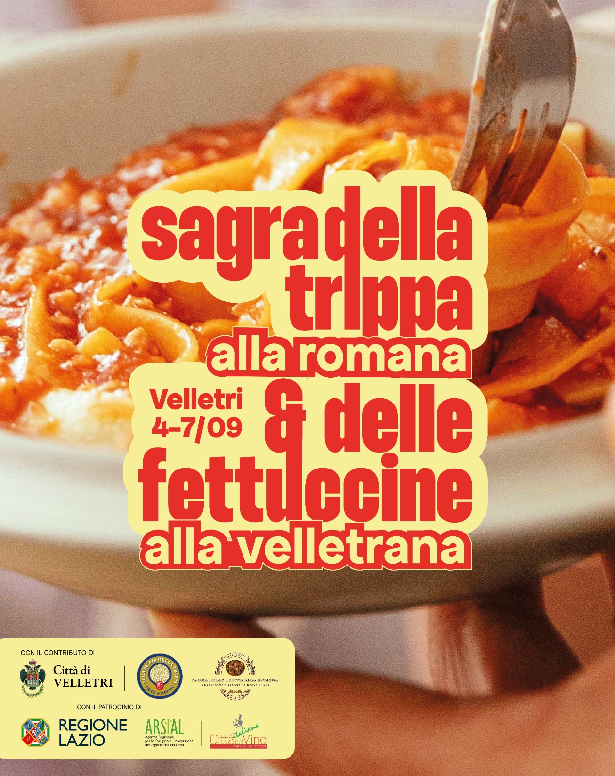 Con il patrocinio della Città di Velletri, della Accademia della Trippa alla Romana, in collaborazione con Regione Lazio e ARSIAL e l'organizzazione dell'APS Tradizioni e Sapori di Noiatri si terrà da giovedì 4 a domenica 7 settembre 2025 la Sagra della Trippa alla Romana e della Fettuccina Velletrana, nell'ampia area ex Amore, lungo la via Appia e a due passi dal centro storico. Fra le novità, quest'anno la trippa sarà preparata dal Ristorante Paradiso di Velletri.