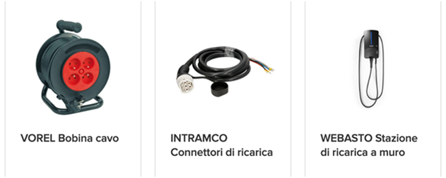 - Bobina cavo, utile quando la stazione di ricarica è lontana dal mezzo. Quello Vorel, ad esempio, si presenta come un rotolo di filo lungo 50 metri avvolto su un apposito supporto, con un pratico manico e quattro prese di corrente da 230V.