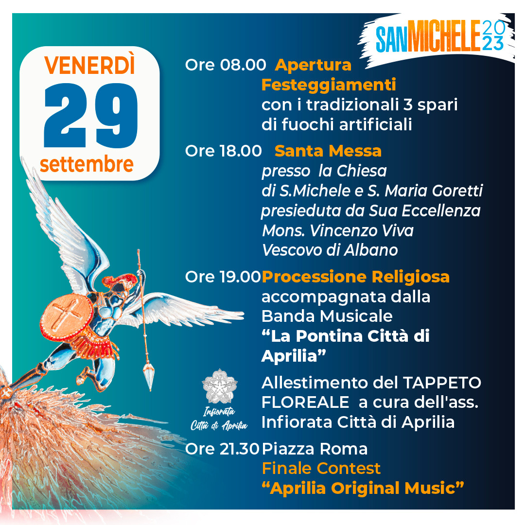 Ad Aprilia al via la festa patronale di San Michele Arcangelo. L’evento clou questa domenica con il concerto de “I Nomadi”. La festa per le vie del centro cittadino prenderà il via domani sera: in Piazza Roma ci sarà la finale del contest Aprilia Original Music. Sabato, a partire dalle 21.00, il concerto delle band locali, con la partecipazione dei “The Latinas & Friends”, che ospiteranno le esibizioni di Roberto Angelini, il Cile e Adamo Dionisi. Domenica1° ottobre si chiude con il concerto de “I Nomadi” - che proprio quest’anno festeggiano i 60 anni di carriera - e con lo spettacolo dei fuochi d’artificio.