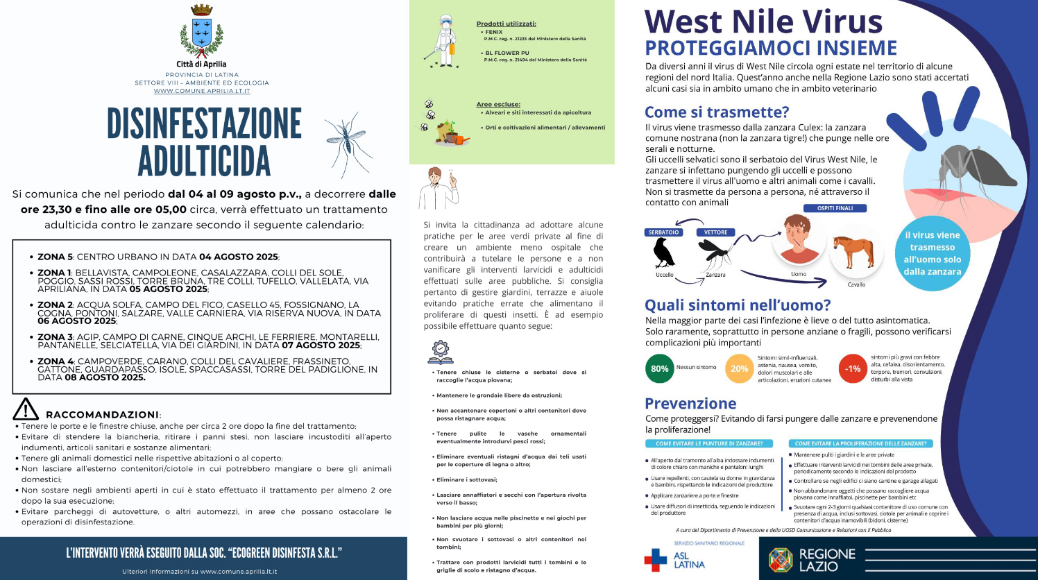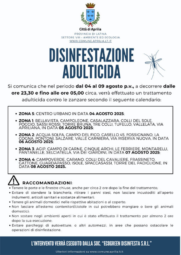 Scatta anche la disinfestazione adulticida ad Aprilia: interventi notturni sono stati programmati dal Comune a partire da lunedì 4 agosto e sino a sabato al 9 agosto. Le operazione verranno eseguite in notturna, dalle 23.00 e sino alle 5.00 del mattino successivo. Il primo trattamento adulticida contro le zanzare verrà effettuato lunedì sera in tutta la zona del centro urbano. La raccomandazione è di tenere porte e finestre chiuse, anche per circa 2 ore dopo la fine del trattamento e di non lasciare all’esterno contenitori o ciotole in cui potrebbero mangiare o bere gli animali domestici. Da lunedì 4 a mercoledì 6 agosto, lo ricordiamo, proseguirà anche la disinfestazione antilarvale dalle 8.00 del mattino e sino alle 17.00.