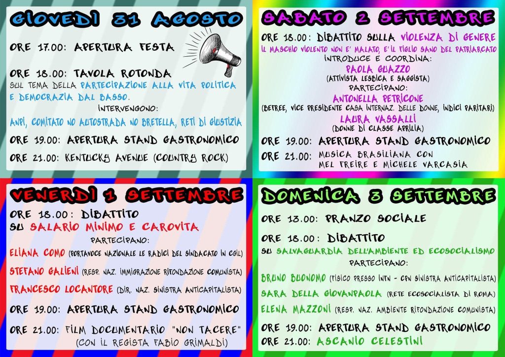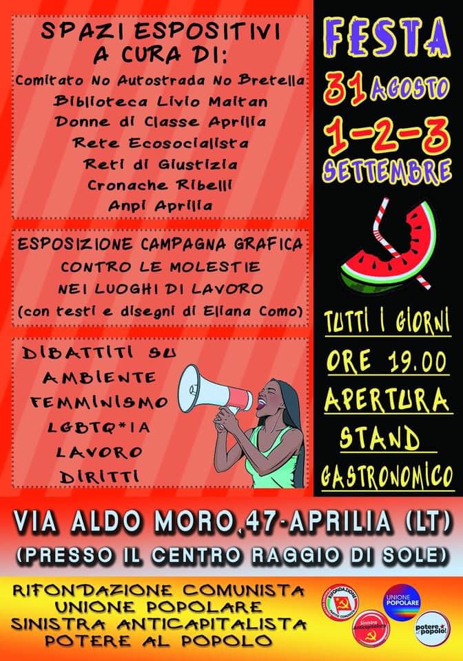 Le articolazioni territoriali di Rifondazione Comunista, Unione Popolare, Sinistra Anticapitalista e Potere al Popolo si ritrovano per una 4 giorni di festa che si terrà da giovedì 31 agosto a domenica 3 settembre presso l'area esterna della Comunità Raggio di Sole, in Aprilia (LT), Via Aldo Moro, dalle 18 alle 24. Un fine settimana di festa e di confronto e dibattito con associazioni, movimenti, cittadini e prestigiosi relatori, sui temi di maggiore rilevanza e attualità, sul piano locale e nazionale.