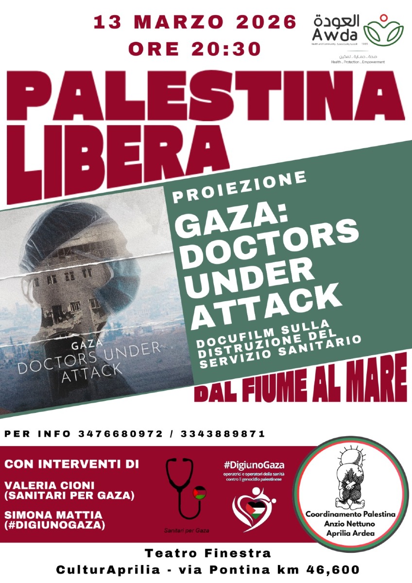Il Coordinamento in solidarietà con la Palestina di Anzio, Nettuno, Aprilia e Ardea invita la cittadinanza, le realtà associative e le organizzazioni per i diritti umani alla proiezione del docufilm “Doctors under Attack” del regista Karim Shah. L’iniziativa,che si terrà venerdì 13 marzo presso il Teatro Finestra di Aprilia, intende squarciare il velo di silenzio sulla sistematica demolizione delle infrastrutture vitali a Gaza, dove gli ospedali sono stati trasformati da presidi di cura a bersagli prioritari di un’azione genocidaria.