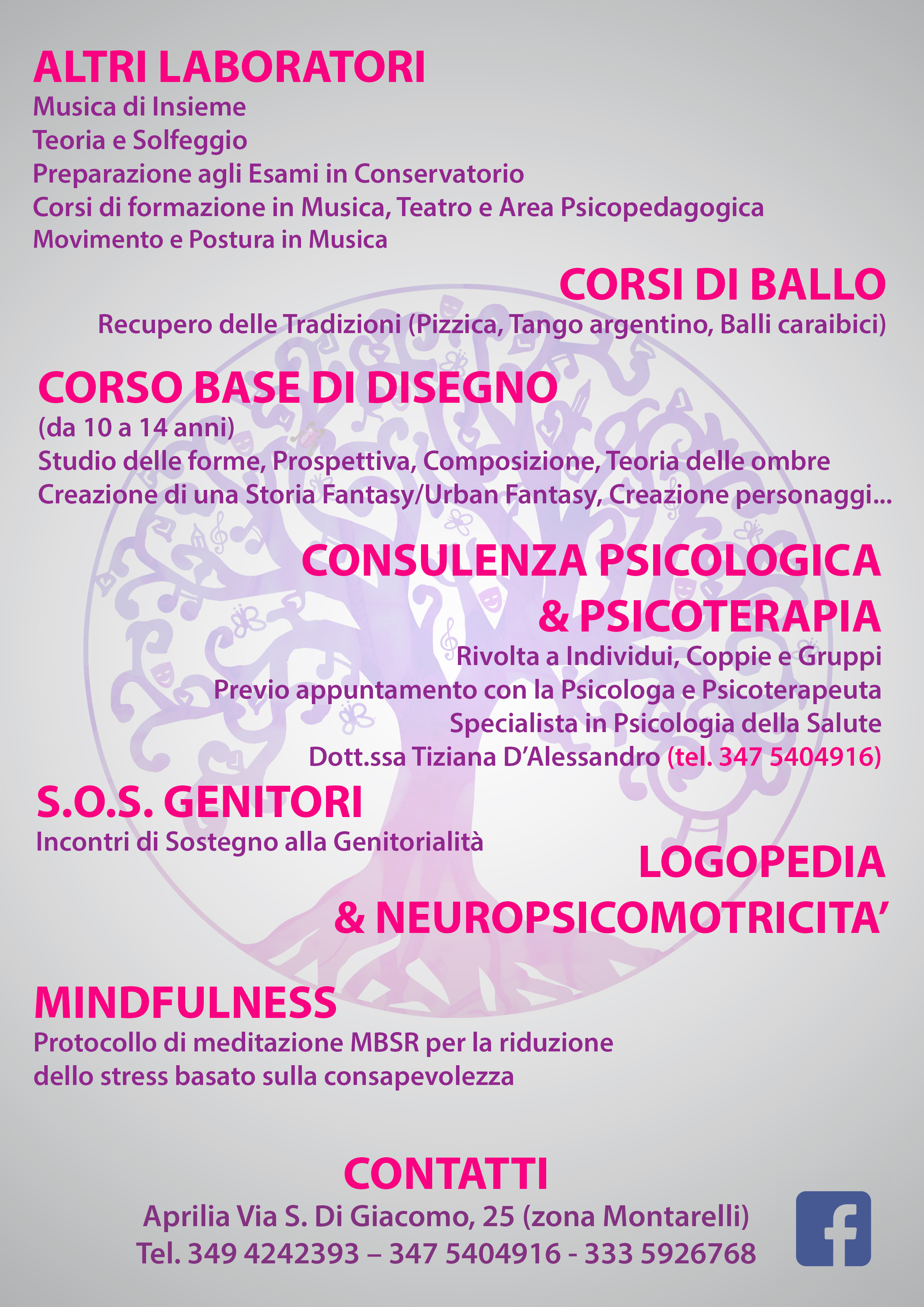 Inoltre sarà possibile, previo appuntamento, richiedere consulenza psicologica e psicoterapia, avviare percorsi di sostegno alla genitorialità, di meditazione Mindfulness, di neuro psicomotricità e di logopedia.