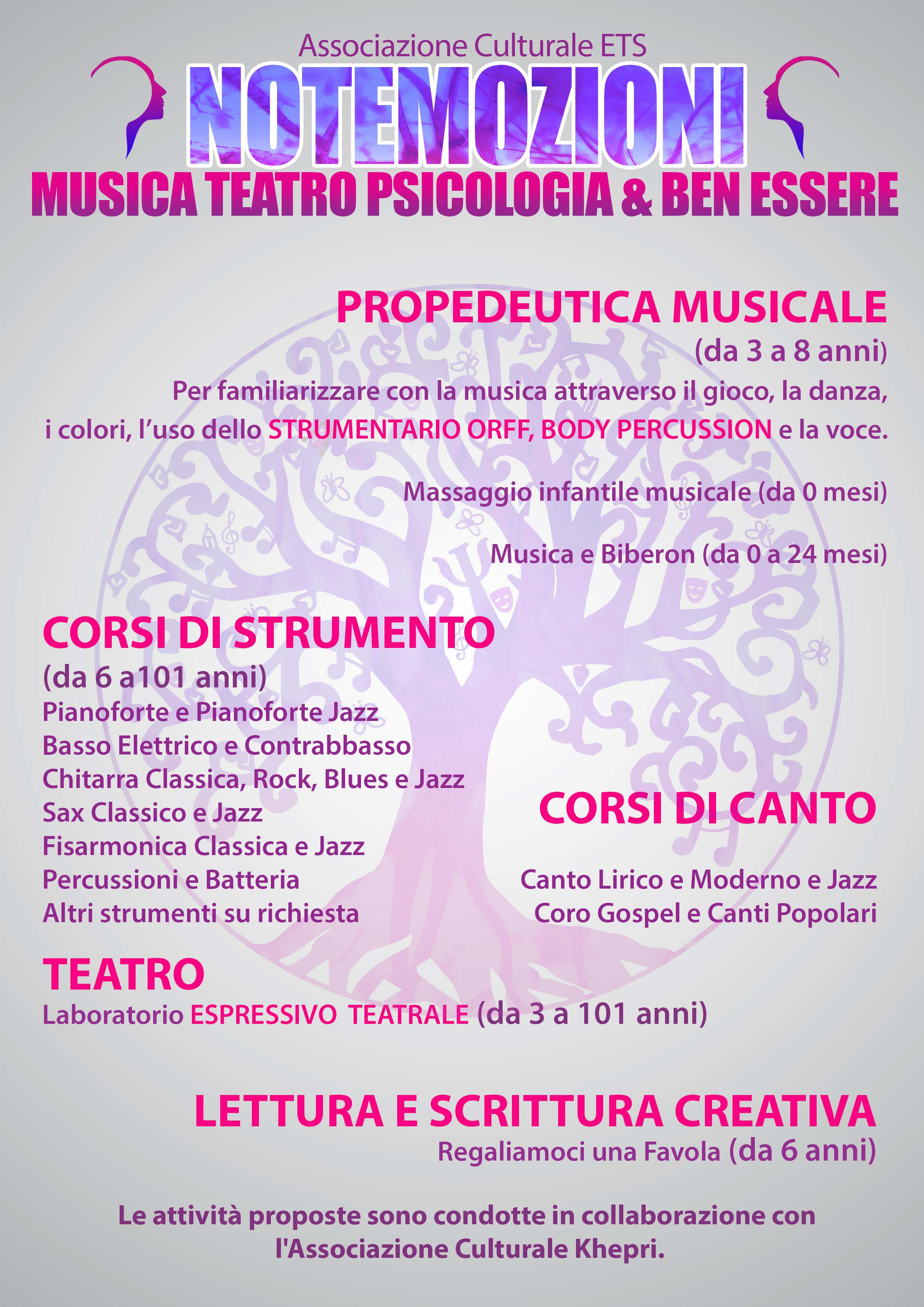La neonata associazione culturale “Notemozioni” (ETS) ha lo scopo di divulgare la cultura e la promozione delle attività non solo nel campo della musica, ma anche del teatro, della psicologia e del benessere con gli obiettivi di sviluppare in ogni essere umano la dimensione psico-fisica, sociale e creativa, di promuovere le life skills ovvero le competenze emotive, sociali e relazionali che permettono di affrontare in modo efficace le esigenze della vita quotidiana.