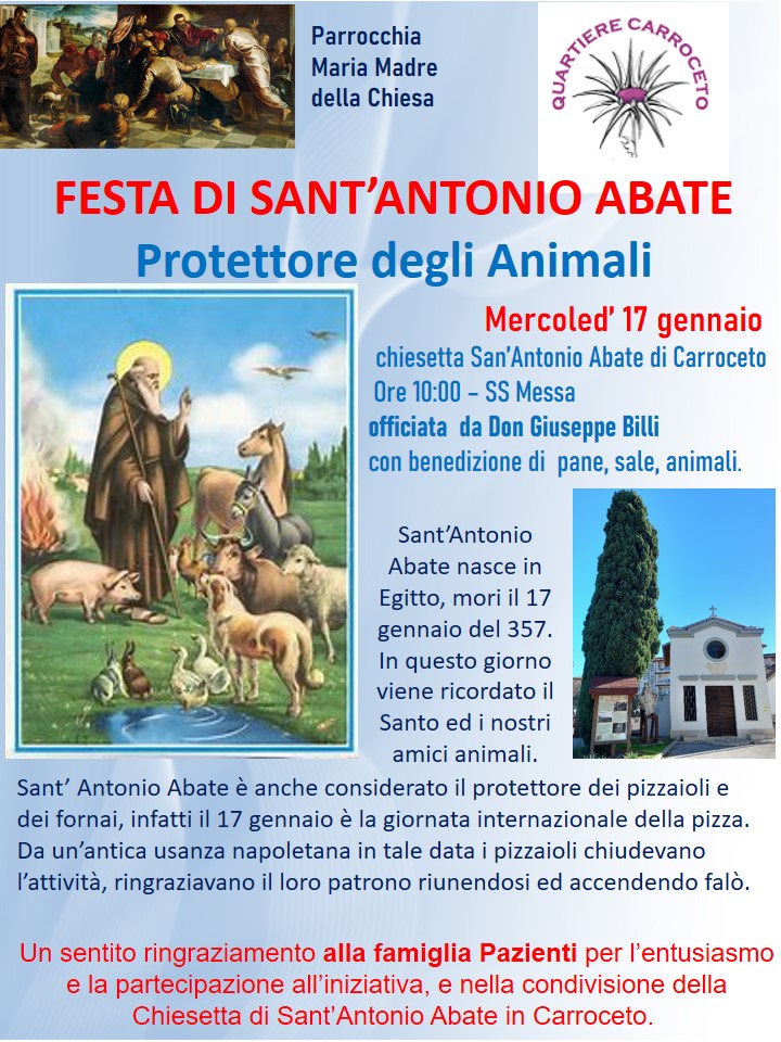 Alle 10 di domani ci sarà una Santa Messa presso la chiesetta Sant'Antonio Abate di Carroceto abbellita con fiori per l'occasione. Officerà Don Giuseppe Billi con la benedizione di pane, sale e animali. Si ringrazia la famiglia Pazienti per l'entusiasmo e la partecipazione all'iniziativa e per la condivisione della chiesetta di Carroceto.