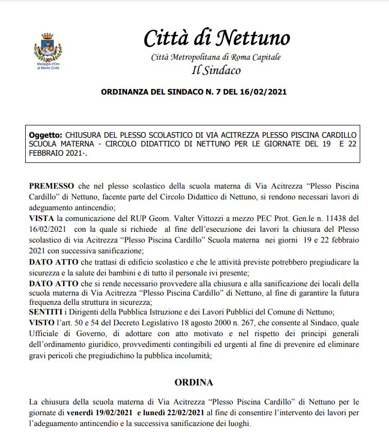 Adeguamento del sistema antincendio e successiva sanificazione dei luoghi: il Comune di Nettuno, per consentire l'esecuzione di lavori, con un’ordinanza ha disposto per venerdì 19 e lunedì 22 febbraio la chiusura del plesso scolastico di Piscina Cardillo.