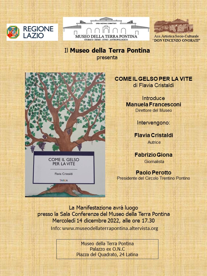 Domani pomeriggio (mercoledì 14 Dicembre) a Latina, al Museo della Terra Pontina, la presentazione del libro di Flavia Cristaldi “Come il gelso per la vite” storie di vita, migrazioni e identità colle...