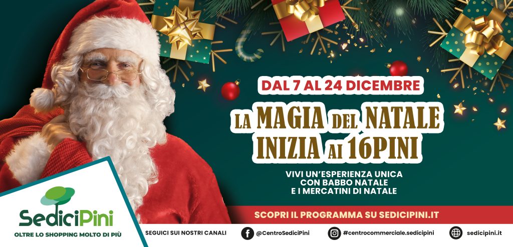 Il Centro Commerciale Sedici Pini di Pomezia è pronto per festeggiare le prossime festività di Natale con un ricco programma di eventi come l'inaugurazione del Christmas Village assieme alle istituzioni di Pomezia sabato 7 dicembre alle 17:30, a seguire il concerto di Natale a cura della famosa orchestra di Roma Eugenio Florio.
