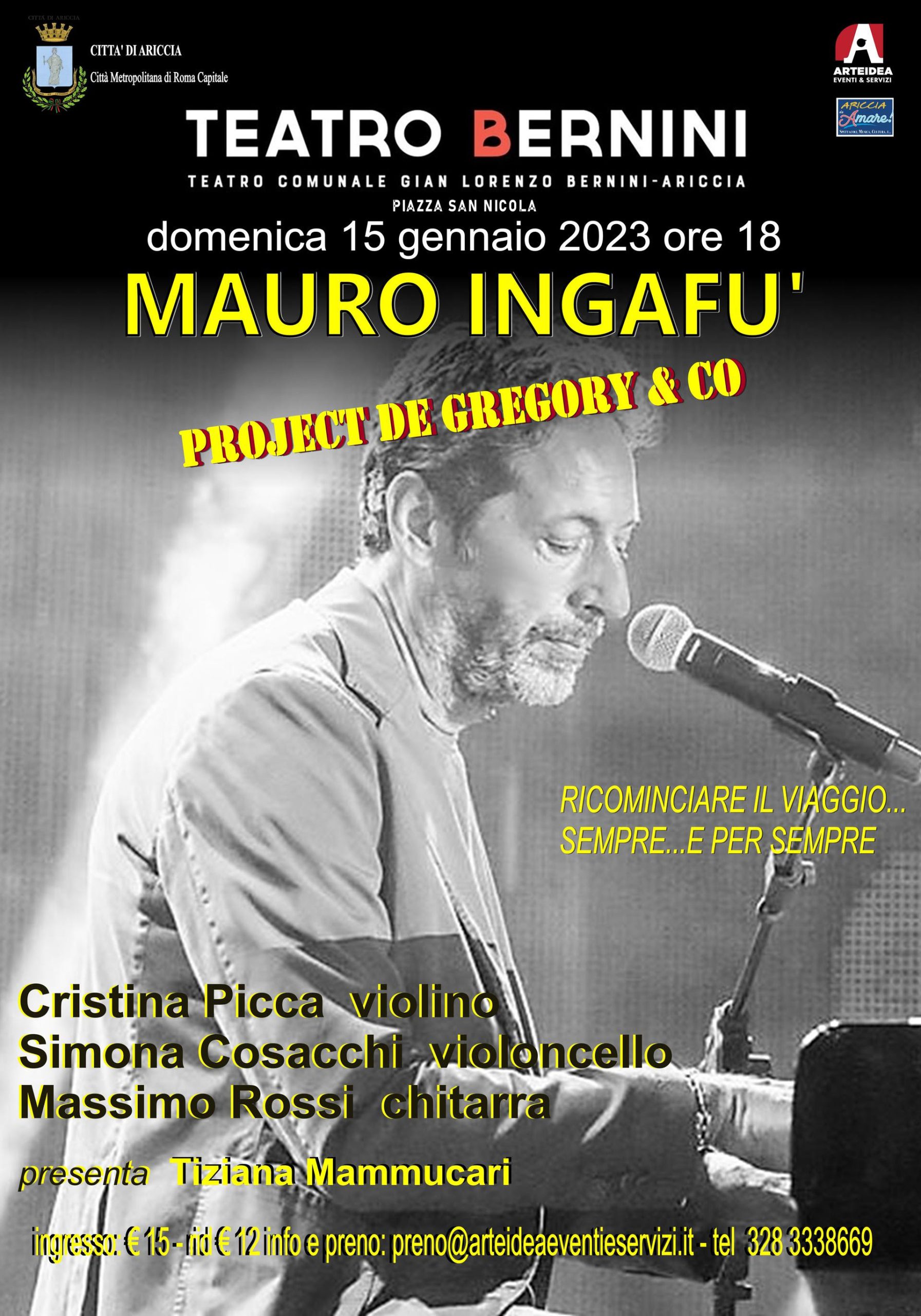 Domenica 15 gennaio, alle 18, al Teatro Bernini è di scena la musica con “Project De Gregori & Co” a cura di Mauro Ingafù (pianoforte e voce), Cristina Picca (violino), Simona Cosacchi (violoncello) e Massimo Rossi (chitarra). Mauro Ingafù propone un progetto sulle musiche di Francesco De Gregori per narrare la storia e cantare le splendide melodie che hanno raccontato e segnato il tempo tramite la voce e le note di uno straordinario artista. Presenta Tiziana Mammucari. Il biglietto ha un costo di € 15 (ridotto € 12) e si può prenotare al numero 328 3338669 o all’indirizzo [email protected].