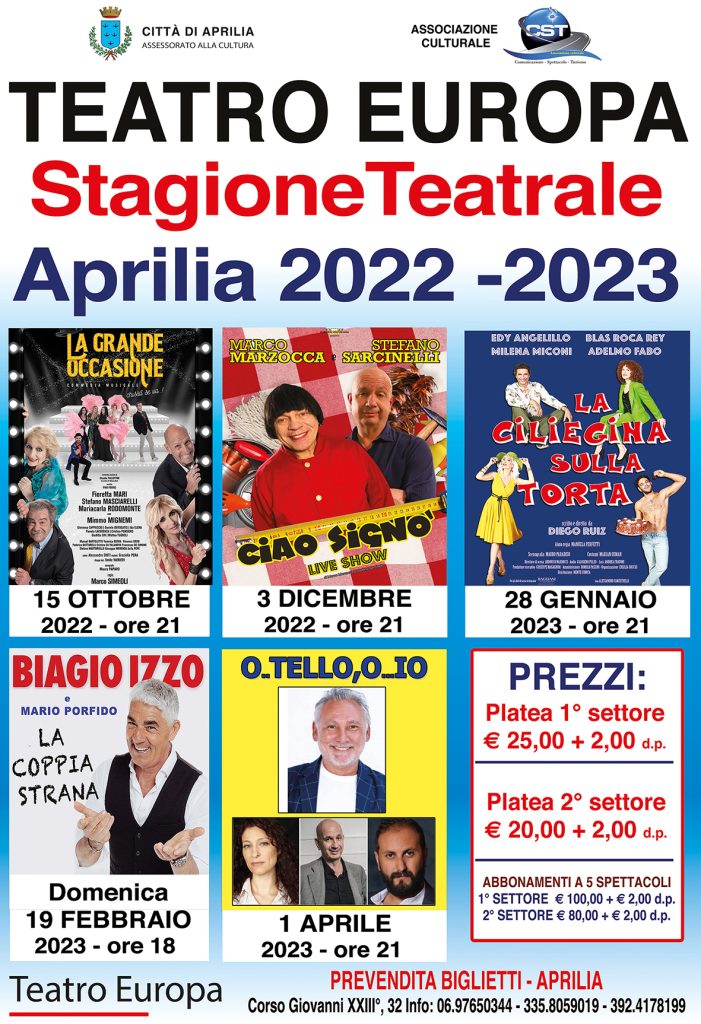 Inoltre abbiamo pensato ad una attività di sensibilizzazione dei giovani al teatro. Il Teatro Europa di Aprilia offre l’opportunità agli under 25 di poter acquistare 5 spettacoli della stagione teatrale 2022-2023 a soli 55 euro. La promozione è valida acquistando l’abbonamento solo al botteghino del Teatro Europa.