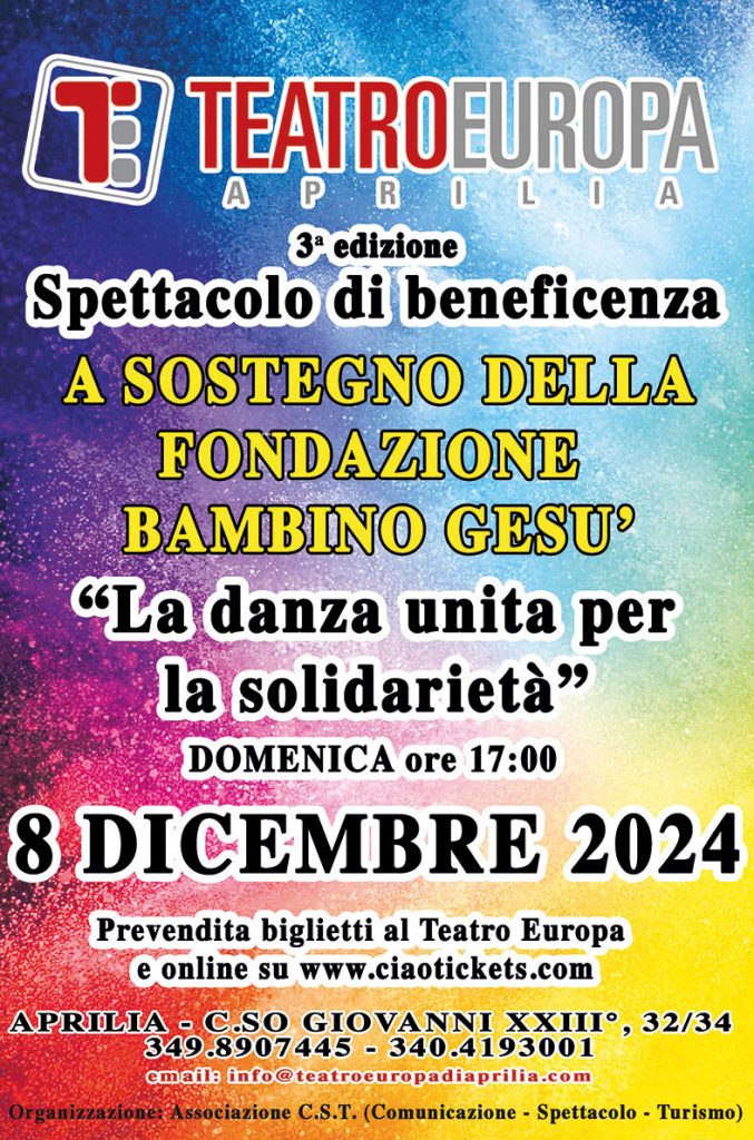 “La danza unita per la solidarietà”: al Teatro Europa di Aprilia questa domenica 8 Dicembre uno spettacolo di beneficienza a sostegno della Fondazione Bambino Gesù. L’appuntamento, giunto alla sua terza edizione, è alle 17.00. Si esibiranno tante scuole di danza ed il cantante Luca Liberini, finalista di “Tu Si Que Vales”.