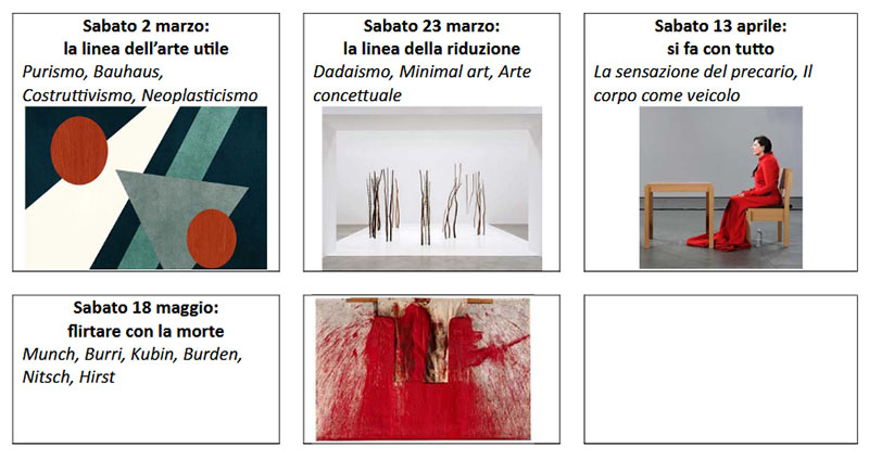 I primi due incontri sono dedicati alla espressività. Nei successivi due incontri verrà approfondita la formatività, in virtù della quale l’operazione artistica è un processo di invenzione e produzione finalizzato a perseguire la forma per sé stessa. Il nuovo anno si aprirà con l’arte onirica, dove l’ispirazione scaturisce dai sogni, dall’inconscio e dalla vertigine che l’artista prova davanti al mistero delle cose, cui farà immediato seguito l’approfondimento riservato all’arte sociale che nella sua esigenza di rappresentare la realtà quotidiana spesso è stata utilizzata quale veicolo propagandistico dalle ideologie.