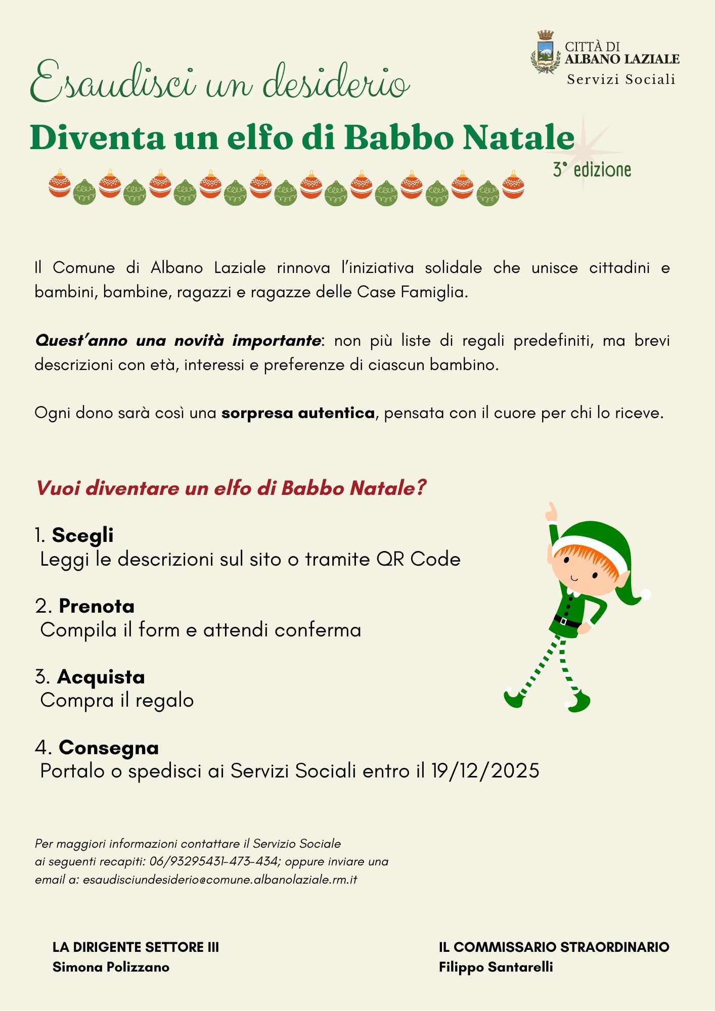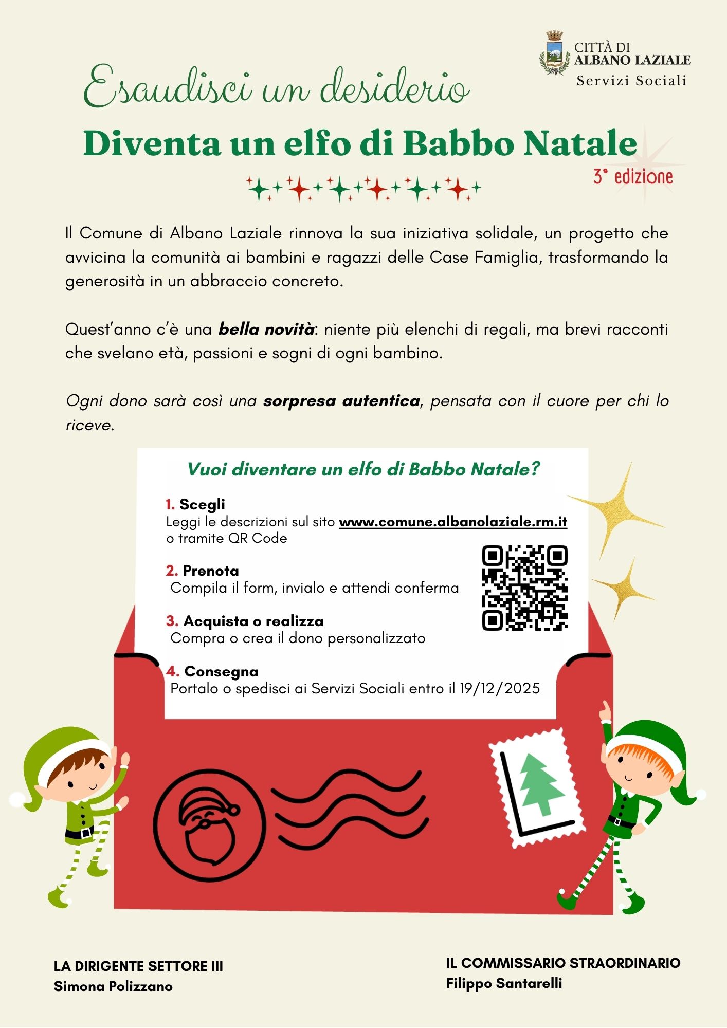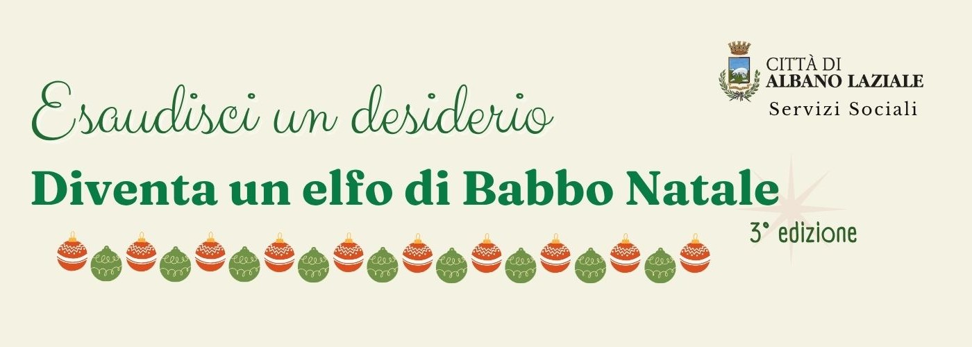 Diventa un elfo di Babbo Natale e realizza un desiderio. Al via la terza edizione dell’iniziativa solidale del Comune di Albano, promossa per esaudire il desiderio di un dono di Natale dei bambini e d...