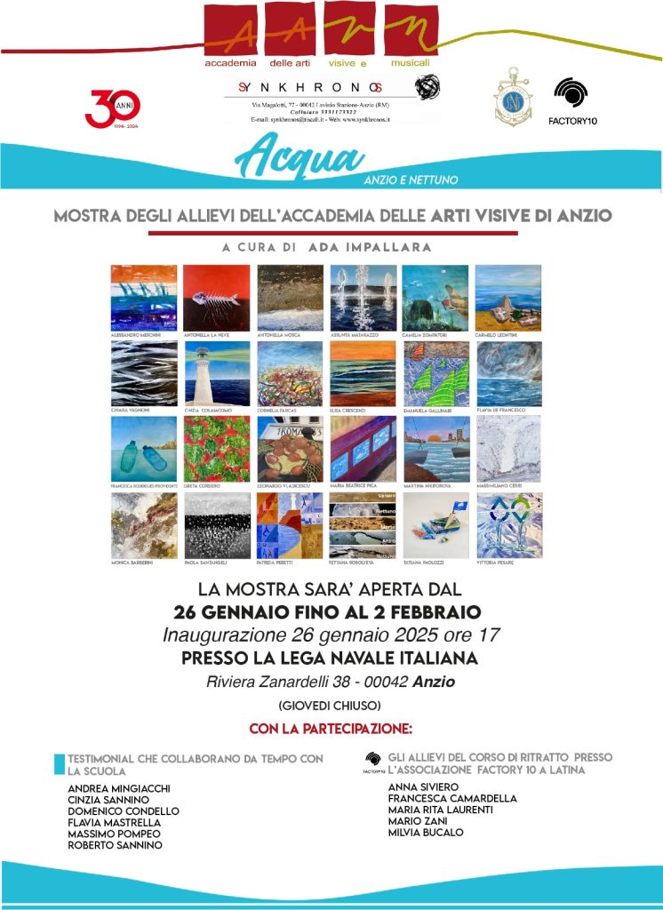Alla Lega Navale Italiana di Anzio, sulla Riviera Zanardelli, la mostra d'arte “L’acqua di Anzio e Nettuno” con le opere degli allievi dell’Accademia Arti Visive di Anzio e dell’associazione Factory10 di Latina. L’inaugurazione questa domenica 26 gennaio alle 17.00. La mostra resterà poi aperta fino al 2 febbraio prossimo.