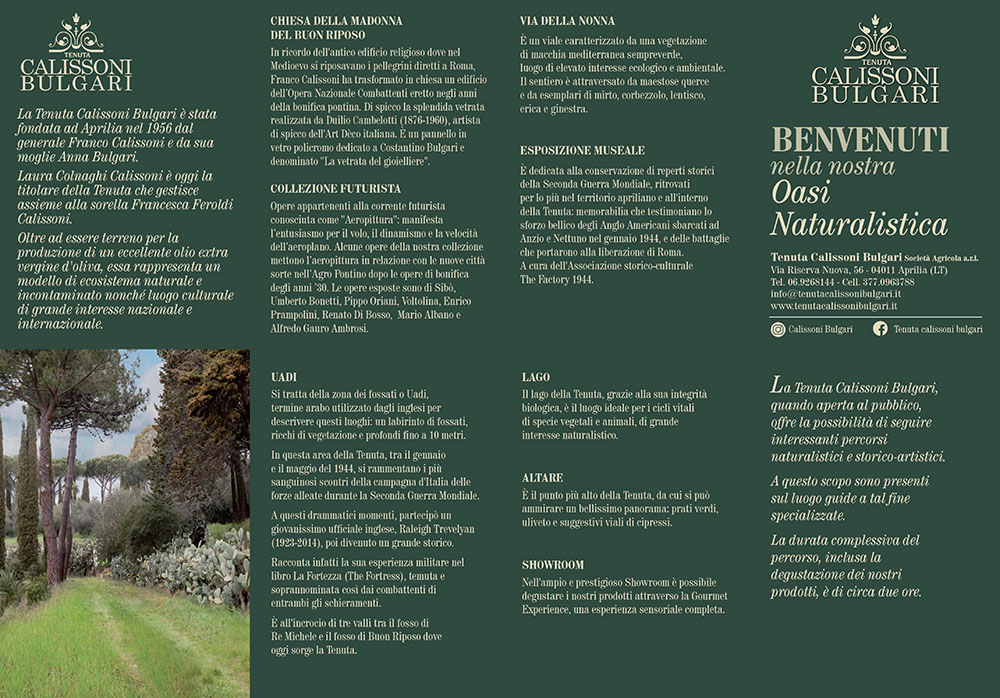 Alla Tenuta Calissoni Bulgari di via Riserva Nuova, ad Aprilia, sta per essere messa a punto l’oasi naturalistica. Questa nuova iniziativa, che propone la Tenuta all’insegna dell'ecologia e della biodiversità, offre la possibilità di seguire interessanti percorsi naturalistici e storico-artistici. Accompagnati da guide specializzate, i visitatori potranno vedere il suggestivo mix di flora e fauna di un’oasi naturale che si estende su ben sessanta ettari di terreno. L'inaugurazione a fine settembre.