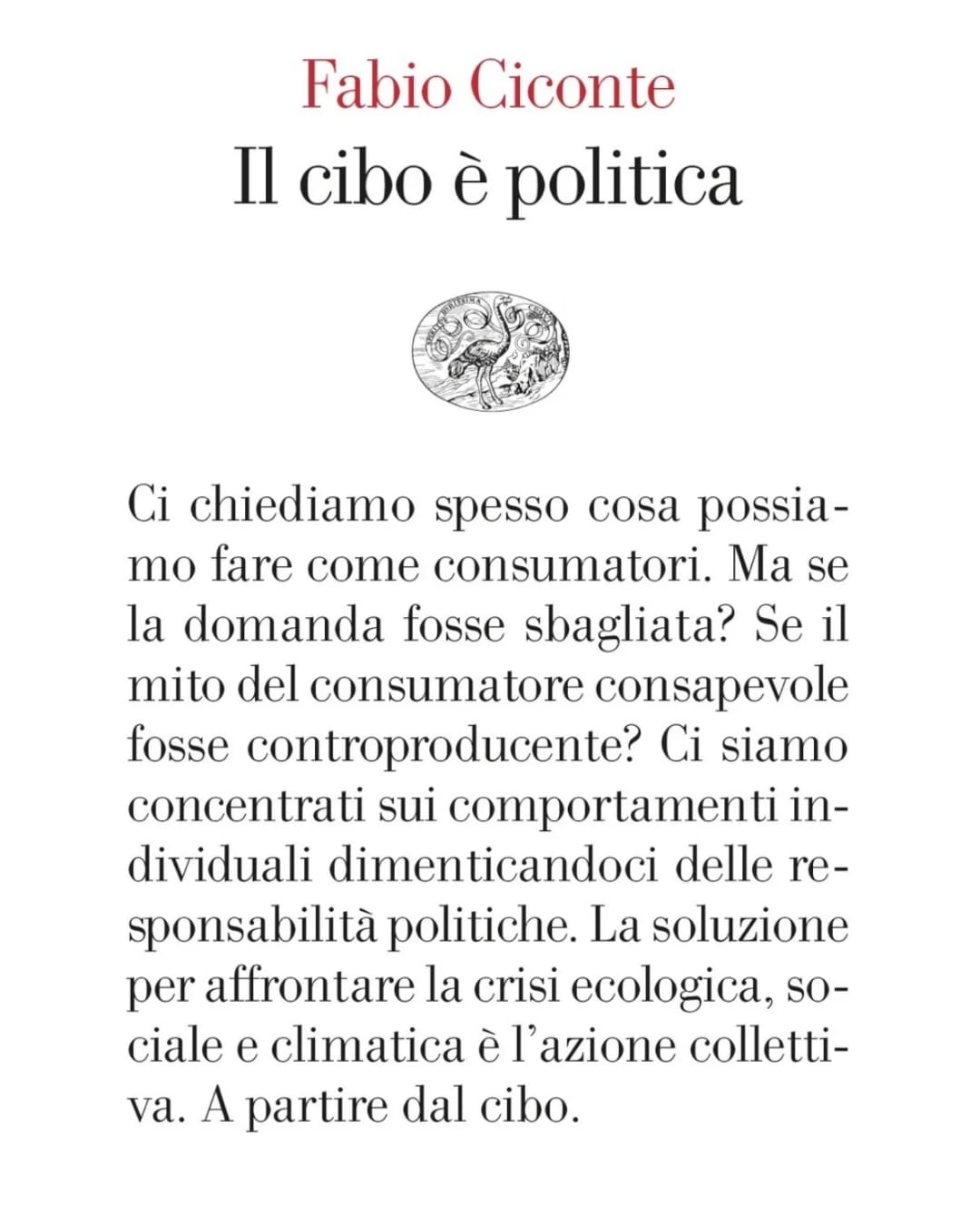 Attraverso il cibo, Ciconte ci invita a leggere le trasformazioni del nostro tempo: la filiera agroalimentare come campo di battaglia sociale, politica e ambientale. Il libro mette in discussione l’idea che la crisi climatica e alimentare possa essere risolta unicamente con le scelte individuali, richiamando invece la necessità di un’azione collettiva, capace di incidere realmente sui sistemi economici e politici.