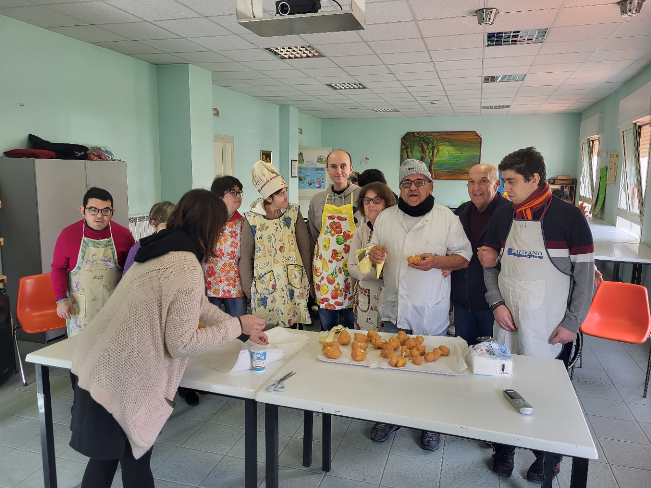 Allievi a lezione di pasticceria alla Comunità Raggio di Sole dell’Agpha di Aprilia, l’associazione dei genitori di portatori di handicap. Il maestro fornaio Franco Caruso, dello storico panificio “Caruso” di Aprilia, questa mattina ha voluto insegnare l’arte del bignè di San Giuseppe ai ragazzi del centro che, con grande entusiasmo, si sono improvvisati pasticceri.