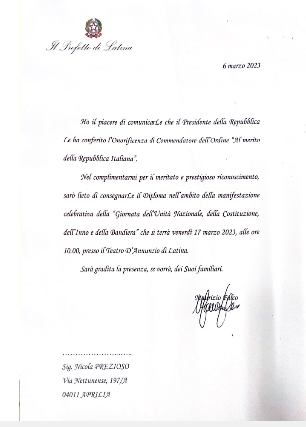 All'imprenditore apriliano Nicola Prezioso l'onorificenza di Commendatore dell’Ordine al merito della Repubblica Italiana.