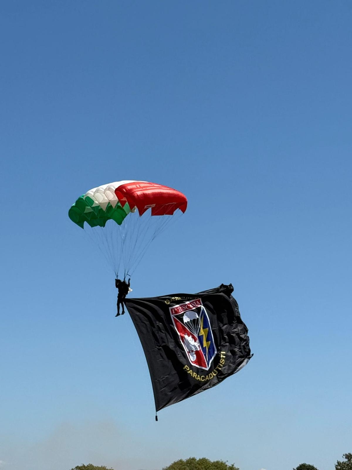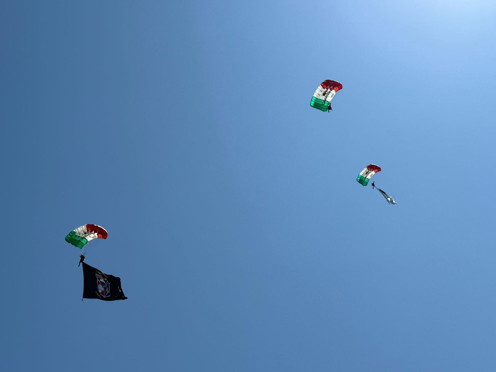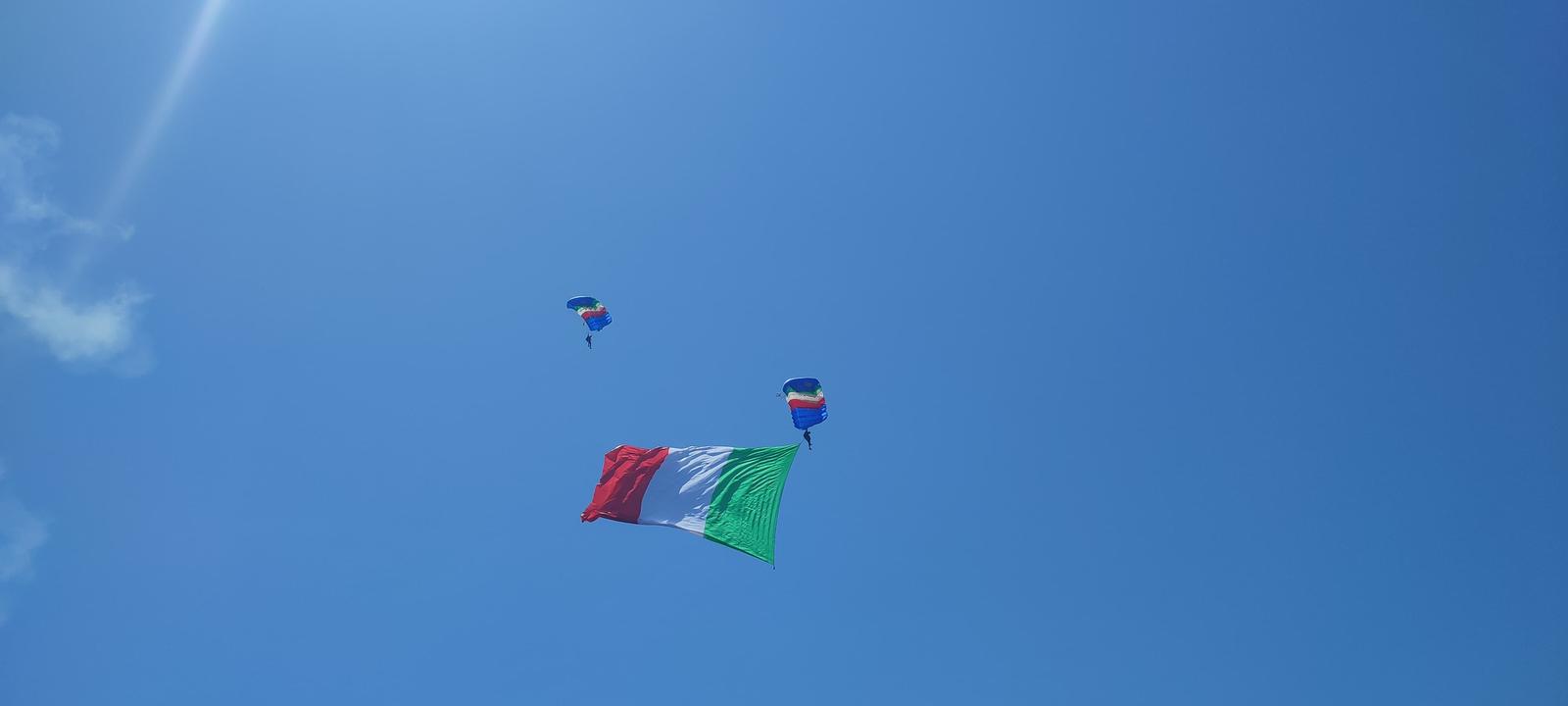 Ha aperto la sequenza di atterraggio la bandiera dell’Aeroclub d’Italia, seguita dai Carabinieri e dal Tuscania. A chiudere l’esercito con tricolore di 300 mq, ad assistere a terra il neo Presidente dell’Aeroclub d’Italia Stefano Arcifa.