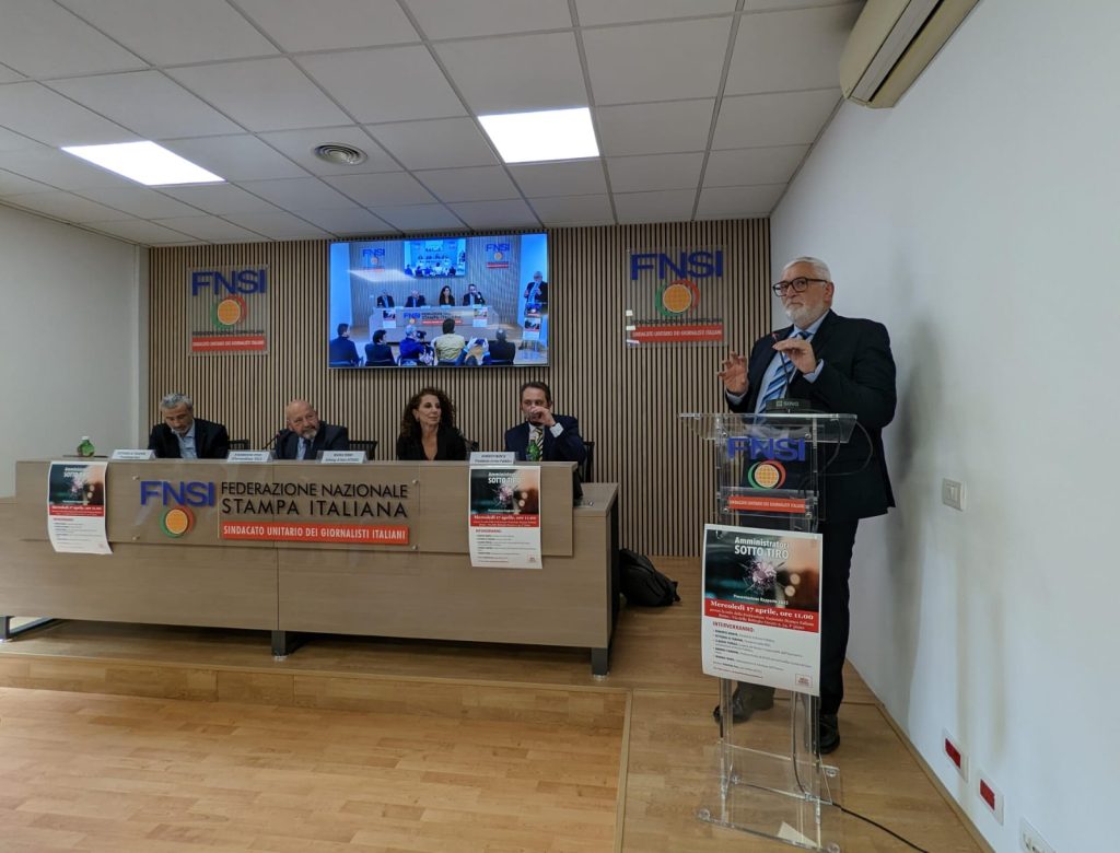 Il presidente di FNSI Vittorio Di Trapani, il presidente di Avviso Pubblico Roberto Montà, la sottosegretaria al Ministero dell’Interno Wanda Ferro, il curatore del Dossier e responsabile dell’Osservatorio parlamentare di Avviso Pubblico Claudio Forleo, il direttore analisi di Acled Andrea Carboni, hanno presentato il dossier relativo alle intimidazioni subite dagli amministratori locali nel corso del 2023, in occasione dell’incontro moderato dal giornalista del Tg3 Fabrizio Feo.