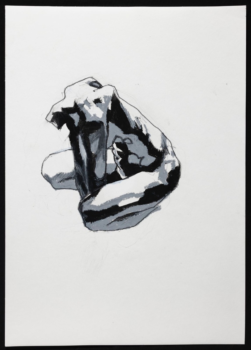 Nello spazio creativo di Mirco Marcacci, il corpo, non più eretto, nervoso e frammentato come un tempo, oggi si manifesta accovacciato, osservato da diverse postazioni, ripreso in svariati frammenti di visioni – prima catturato in una fotografia per poi essere traslato in un dipinto -, quasi appiattito sulla linea orizzontale della terra su cui poggia e con cui sembra fondersi. Diviene groviglio di materia, ma non di forme e superfici, ma di pulsioni e tensioni. E nello sforzo di tenersi presente, questo corpo si trasforma continuamente.