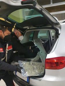 All’interno del vano posteriore era stato installato un finto pannello che serviva a nascondere un doppio fondo il cui accesso era consentito solo tramite un meccanismo elettromeccanico dedicato. Aprendolo i militari hanno scoperto che all’interno erano stati occultati ben 20 kg di sostanze stupefacenti fra cocaina, marijuana e hashish, tutte suddivise in confezioni di oltre mezzo chilo l’una.