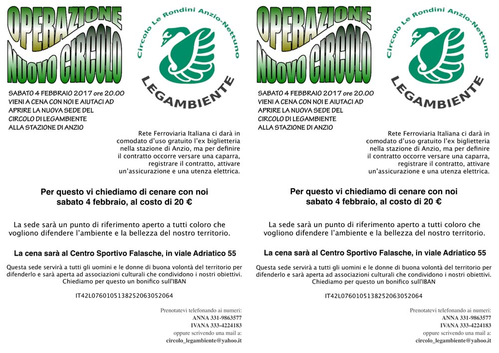 ANZIO – Mancano i soldi della caparra, Legambiente organizza una cena di autofinanziamento.