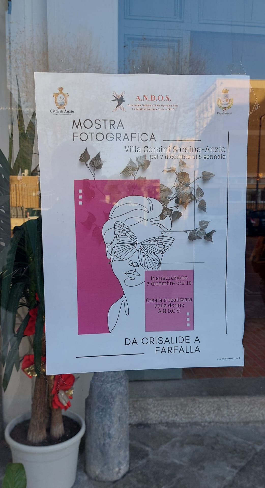 Fino al prossimo 5 Gennaio ad Anzio, presso la Casa Comunale di Villa Corsini Sarsina, è aperta al pubblico la mostra fotografica “Da Crisalide a Farfalla” - un viaggio tra immagini di rinascita e di speranza - allestita dall’Andos, l’Associazione Nazionale Donne Operate al Seno. La mostra, allestita al piano terra, si può visitare dal lunedì al venerdì, dalle 9.00 alle 17.00.