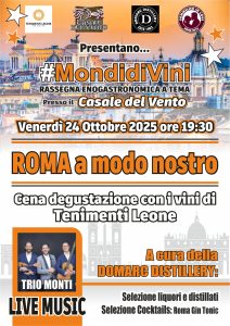 Ad accompagnarvi la musica dal vivo dello strepitoso Trio Monti e, a chiudere, i premiati liquori e distillati artigianali della DOMARC DISTILLERY, con il famoso RomaGinTonic.